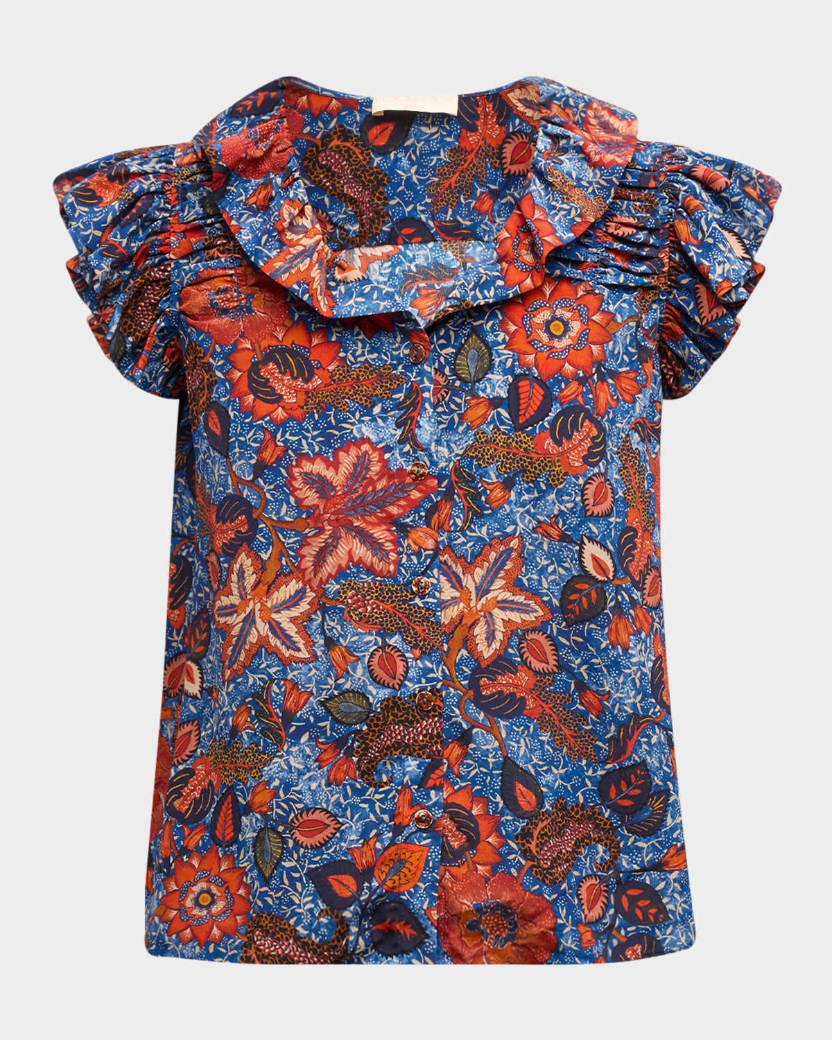 Ulla Johnson "Ivette" floralprint top with ruffles and shirred detailing Approx. 23.5"L from shoulders to hem V neckline; button front Sleeveless Back yoke Relaxed fit Silk Dry clean Imported