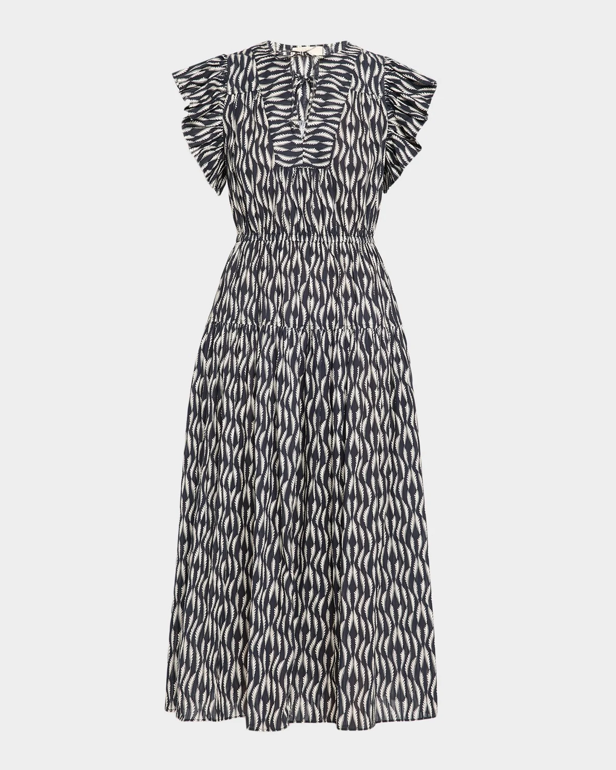 Featuring a classic Ulla Johnson silhouette, the "Kairi" midi dress is crafted from a cotton blend and accented with a bold, twotone print. Split V neckline with selftie Short flutter sleeves Side pockets Aline silhouette Hem falls below the knee Slipover style Cotton/viscose Dry clean only Imported
