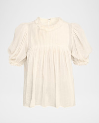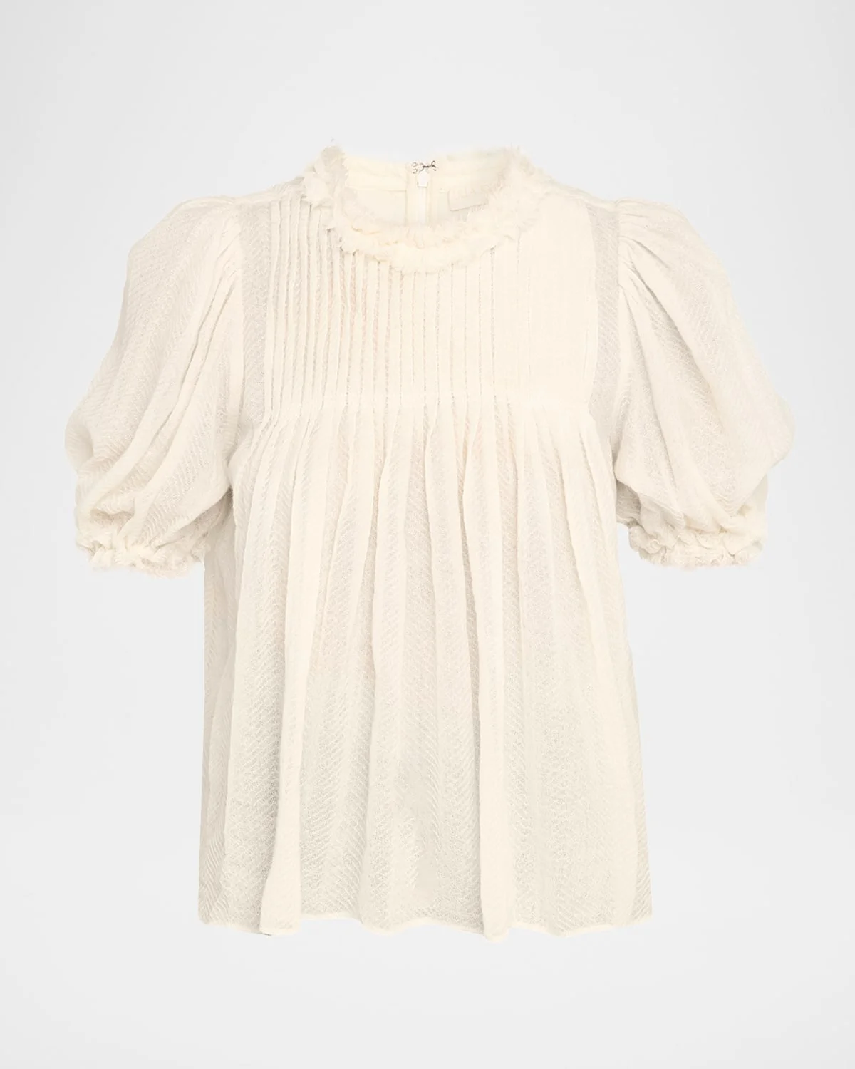 Crafted in an airy wool with a tonal chevron motif, the "Karlyn" top by Ulla Johnson boasts a pleated yoke and frayed trim. Crew neckline Short sleeves Loose fit Hem falls to the hip Invisible back zip Wool Dry clean Imported