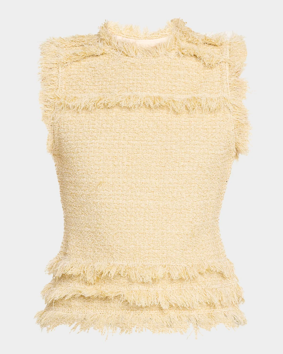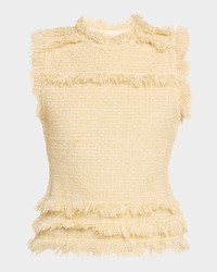 Crafted from knit tweed, the "Kassi" top by Ulla Johnson is finished with fringed trim for a striking silhouette. Crew neckline Sleeveless Slim fit Hem sits at the hip Pullover style Polyester/Jutecell® viscose/nylon/polyamide Dry clean Imported