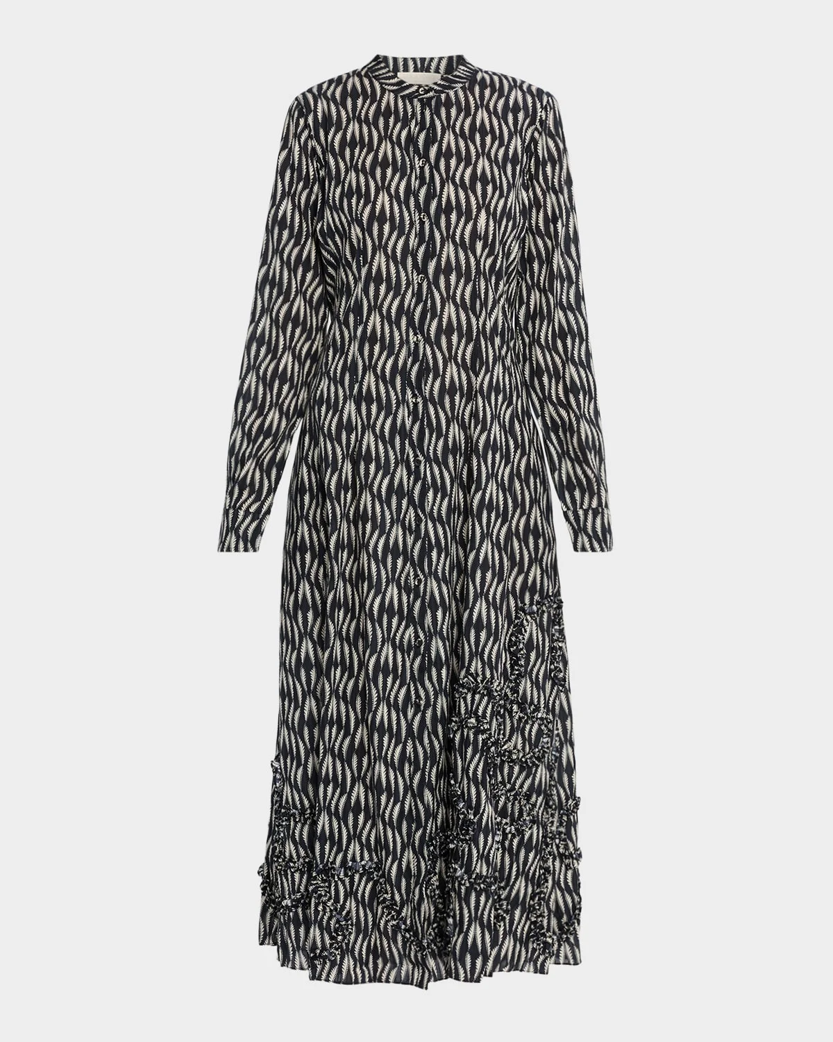 The "Laurentine" shirtdress by Ulla Johnson features a bold print and ruffled detailing along the hem Band collar Long sleeves; button cuffs Hem falls below the knee A-line silhouette Button front closure Cotton/viscose Imported