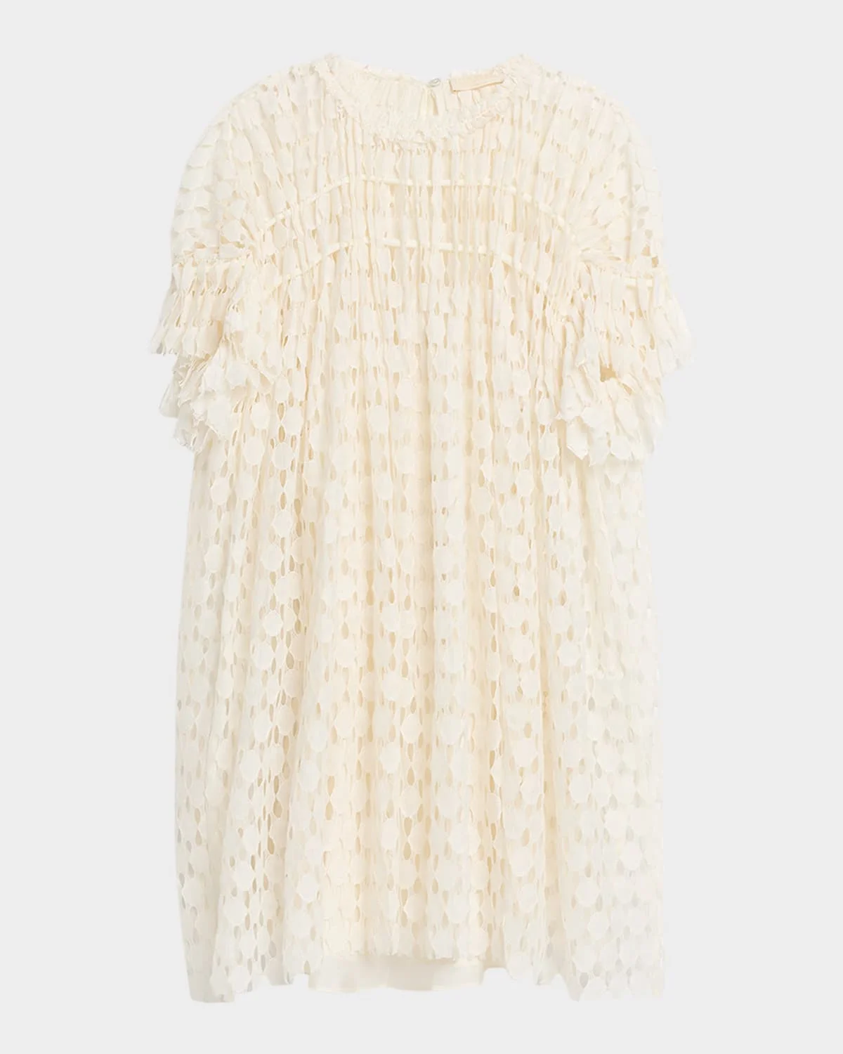 Ulla Johnson "Layla" cotton lace mini dress adorned with open-work detailing inspired by traditional & nbsp;French Alencon needle lace. Round neckline Short sleeves with tie cuffs & nbsp; Shift silhouette Hem falls above the knee Back tie and button closure & nbsp; Cotton/nylon/polyamide Dry clean only & nbsp; Imported SIZE & FITModel measurements: 5 & apos;10" tallModel is wearing a US size 4/Small