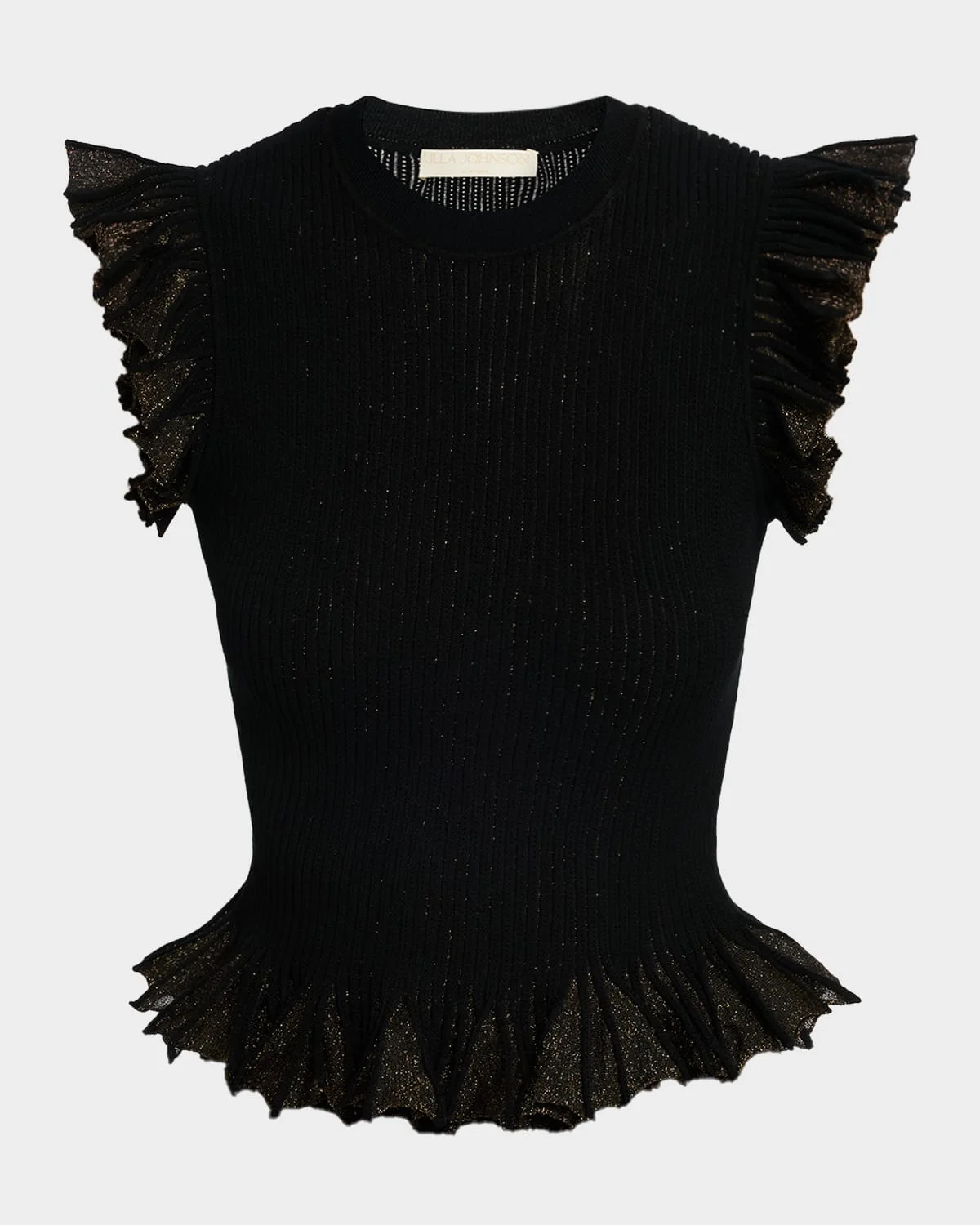 Crafted from sparkly ribknit, the "Leila" top by Ulla Johnson is finished with ruffled trim for a feminine silhouette. Crew neckline Flutter sleeves Classic fit Hem sits at the hip Pullover style Viscose/polyester Dry clean Imported