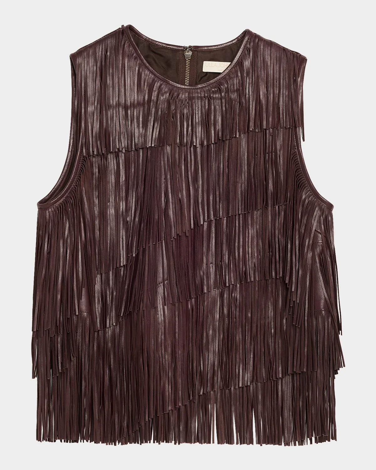 Exhibiting a Western-inspired design, the "Leonie" top by Ulla Johnson is cut from genuine lambskin leather fringe and boasts a tiered silhouette that creates dramatic movement with every step. Crew neckline Sleeveless Boxy fit Hem sits at the hip Center back zip & nbsp; Leather Professional cleaning recommended Imported SIZE & FITModel measurements: 5 & apos;10" tallModel is wearing a US size 4/Small