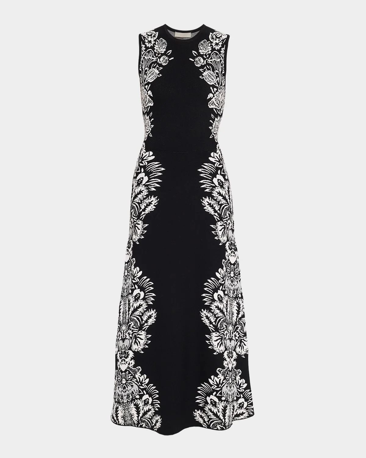 Featuring a contrast botanical print that frames the silhouette, the "Liana" dress by Ulla Johnson is crafted in stretch jacquard knit for endless comfort. Crew neckline Sleeveless Slim, Aline silhouette Full length Slipover style Viscose/polyester Dry clean Imported