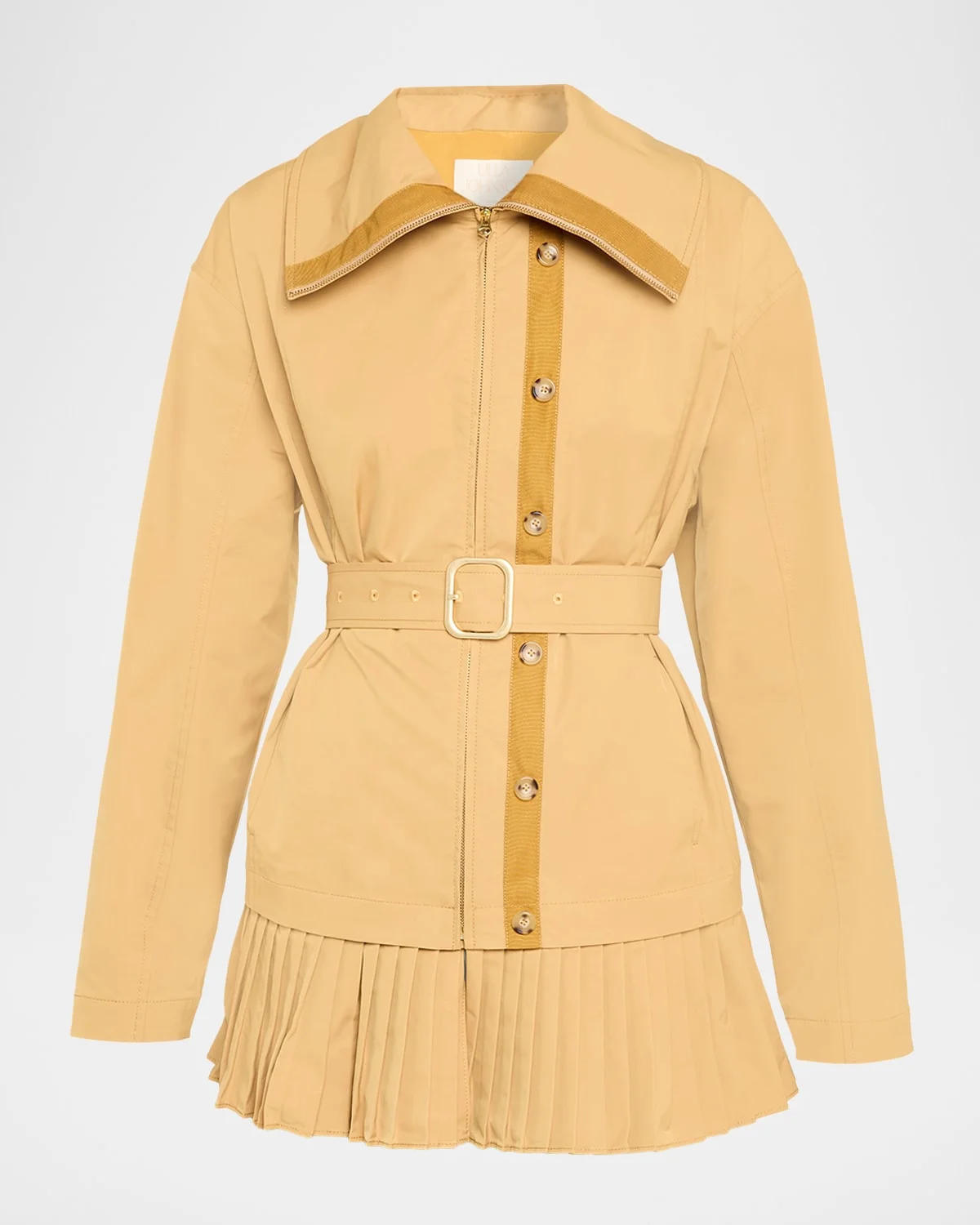 Finished with a pleated hem and ribbon button detailing, the "Lison" jacket by Ulla Johnson boasts a tailored, utilitarian silhouette with a removable belt to cinch the waist. Wide collar; zipfront Dropped shoulders Long sleeves Relaxed fit Hem falls to the hip Polyester Dry clean Imported