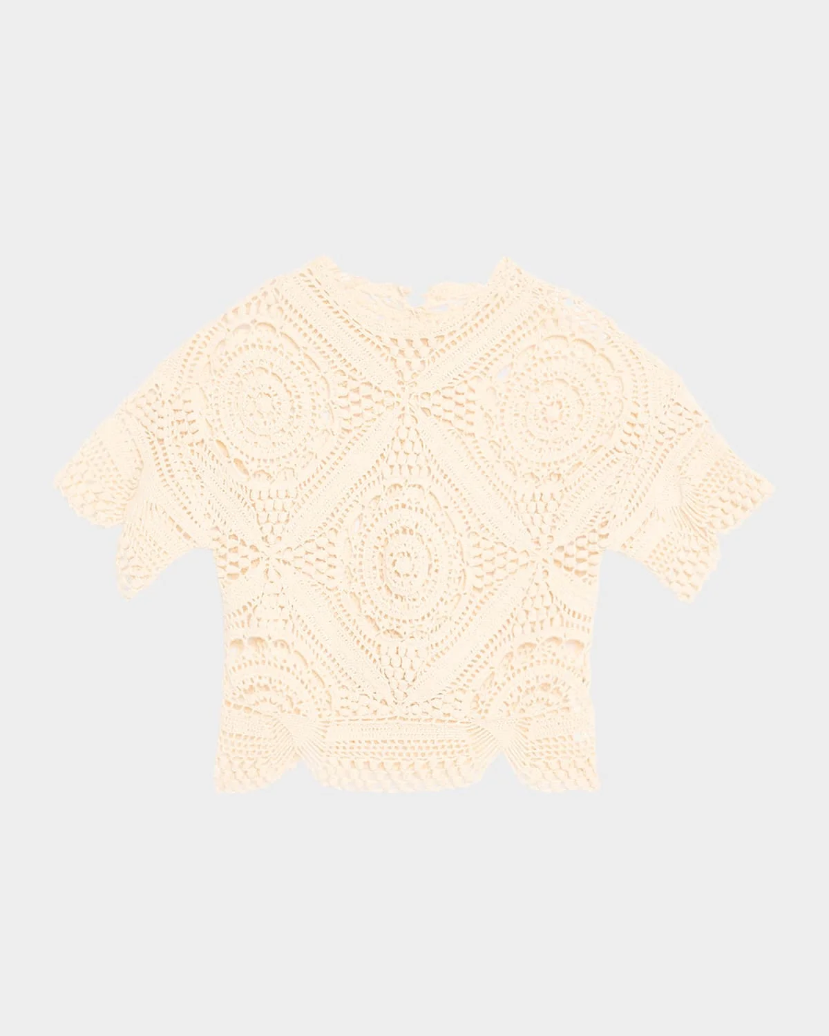 Handmade in cotton crochet, the "Maddalena" top by Ulla Johnson features intricate openwork and a cut-away hem for a unique silhouette. High neckline Short sleeves Slim fit Hem sits at the hip Back button closure & nbsp; Cotton Unlined & nbsp; Dry clean & nbsp; Imported