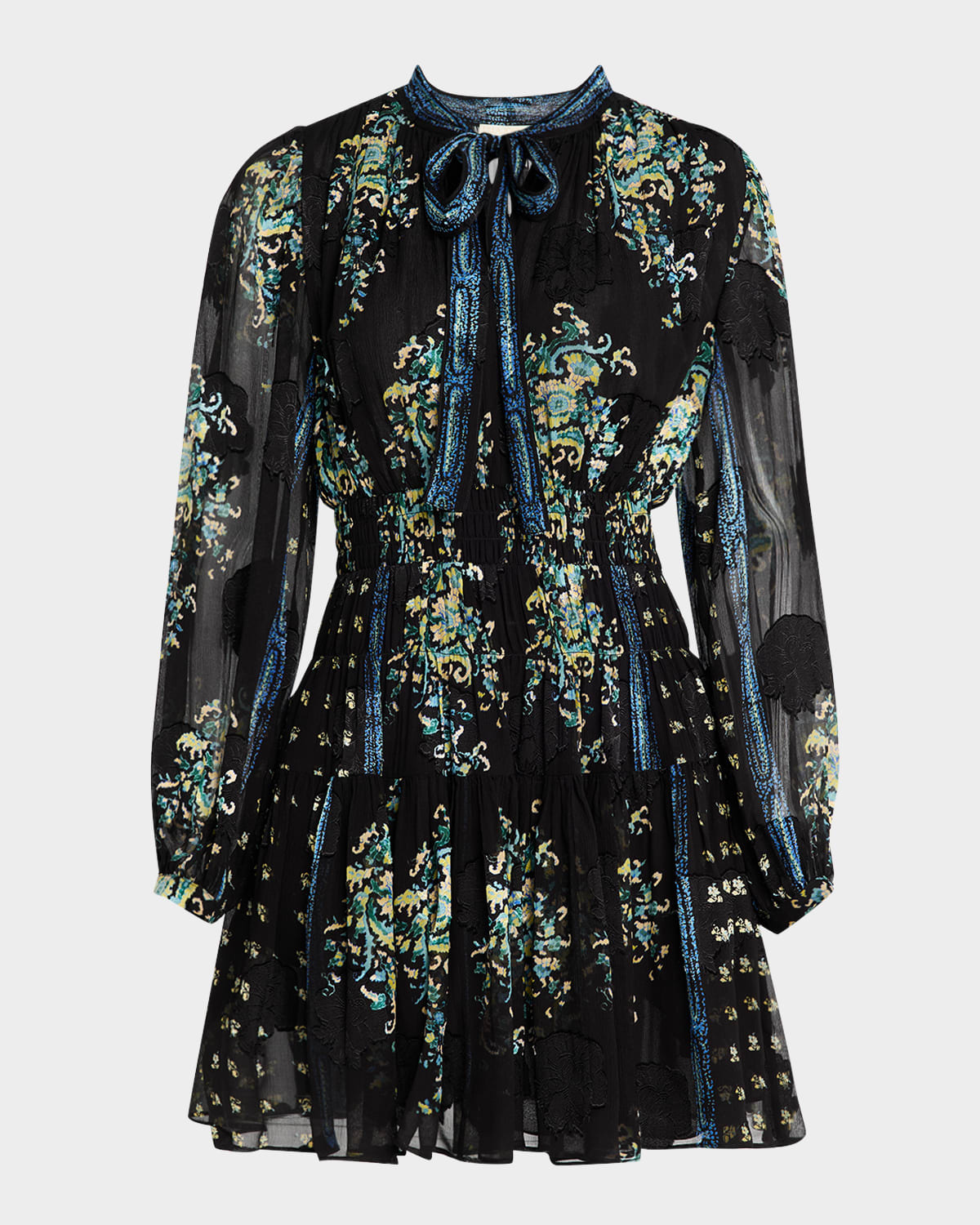 - Ulla Johnson "Maris" printed silk mini dress embellished with a self-tie neckline - Long sleeves with elastic cuffs - Smocked waist - A-line silhouette - Hem falls above the knee - Slipover style - Silk - Dry clean - Imported