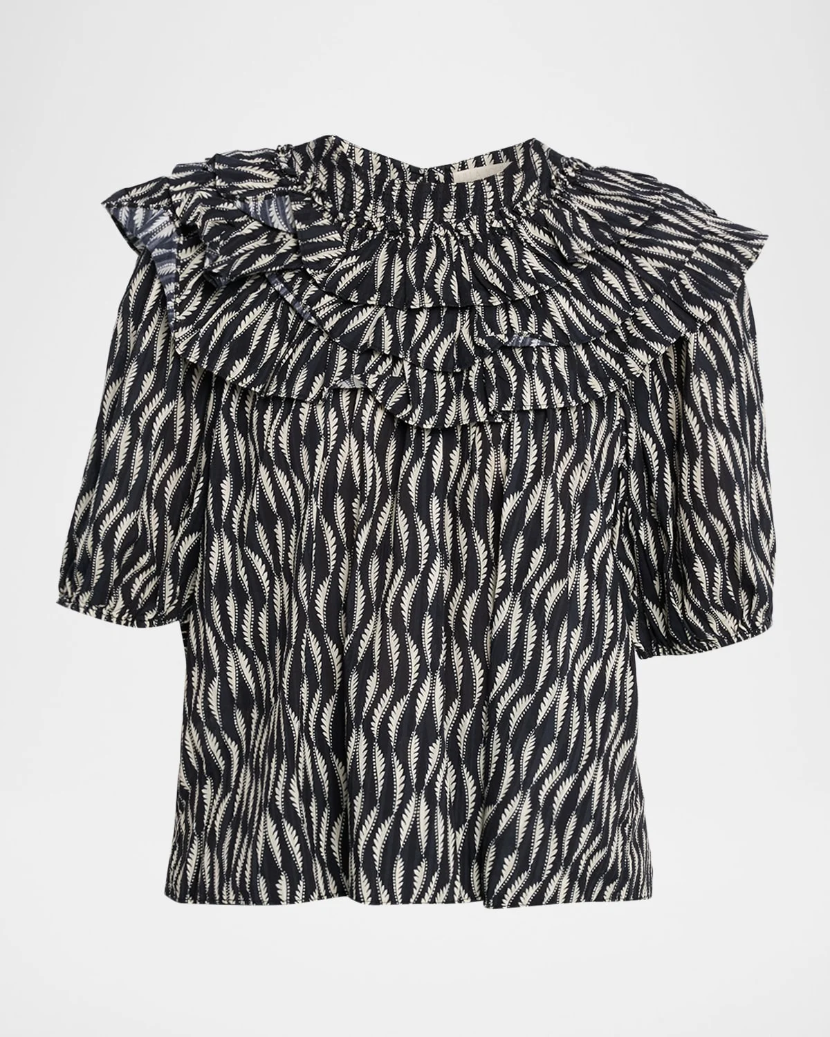 Ulla Johnson "Mira" blouse is crafted from an abstract printed cottonblend featuring puff sleeves and tiered ruffle along the neckline Crew neckline; fourbutton front Short puff sleeves; selftie cuffs Relaxed fit Pullover style Cotton/viscose Imported
