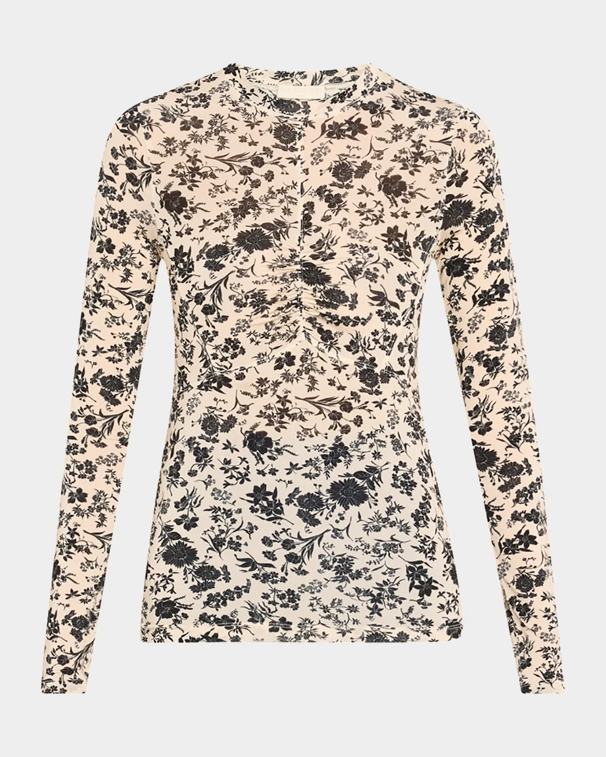 Ulla Johnson "Neri" ruched top patterned in a vintagestyle floral print Crew neckline Long sleeves Fitted Pullover style Rayon/cellulose acetate/elastane Machine wash hot Imported