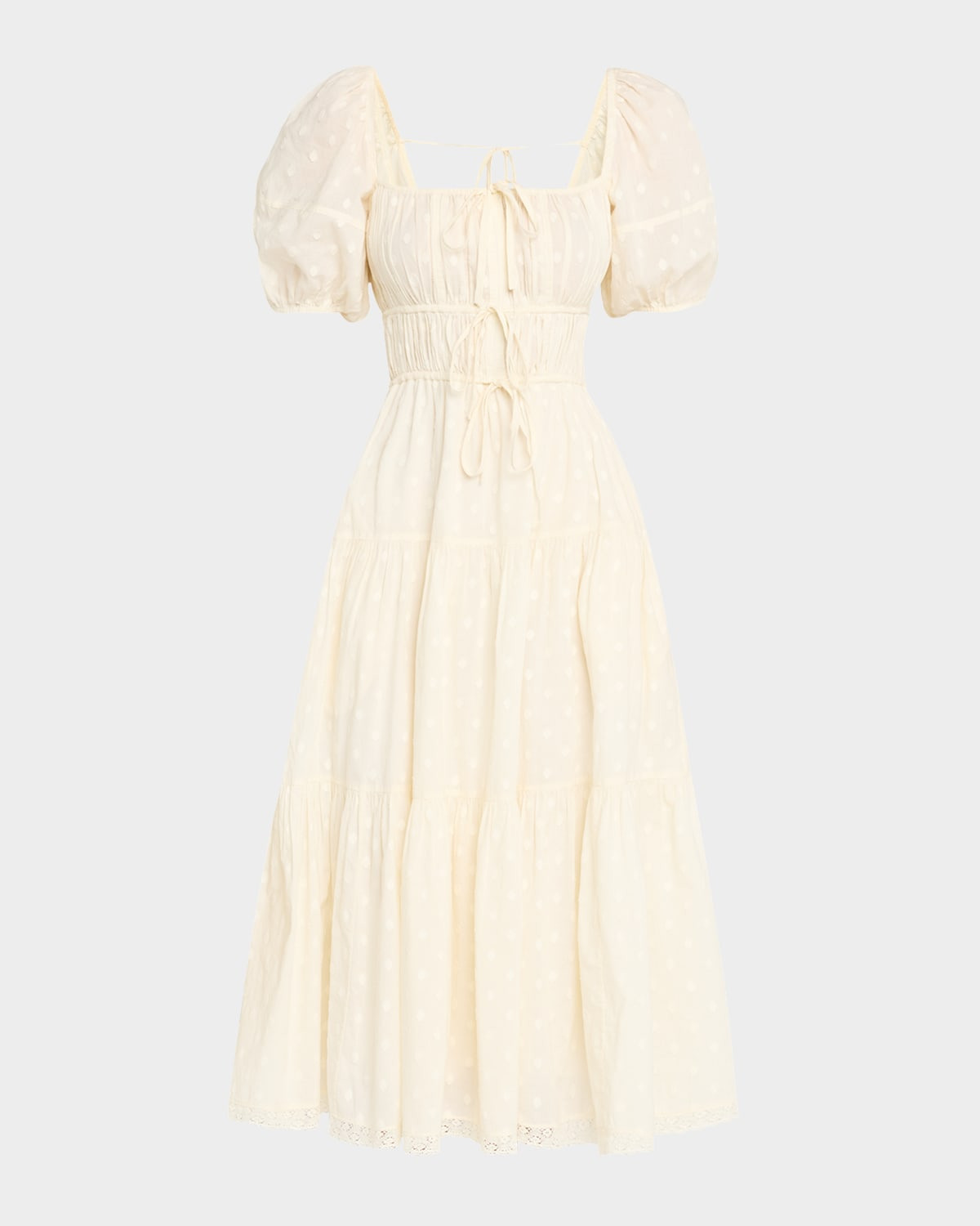 - Ulla Johnson "Palma" tiered midi dress featuring a delicate polka dot print - Square neckline; tie front - Short puff sleeves - A-line silhouette - Hem falls below the knee - Back tie closure - Cotton - Lining: Cotton - Machine wash cold - Imported