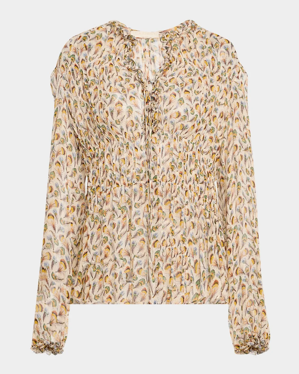 - Ulla Johnson "Robbie" printed luxurious silk blouse finished with ruffle trim - V neckline - Long sleeves - Classic fit - Hem falls to the hip - Tie-front - Silk - Dry clean - Imported