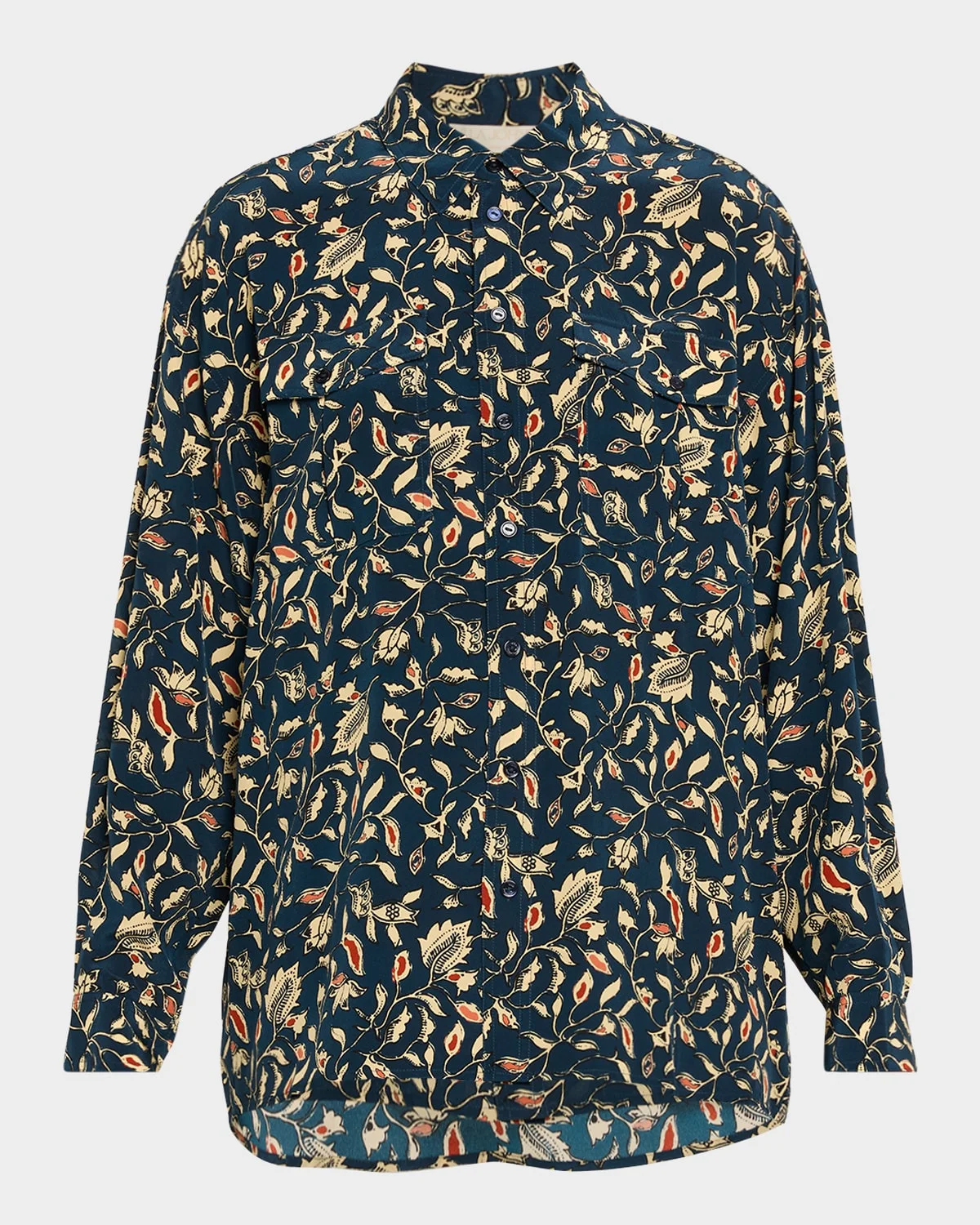 The Ulla Johnson "Soren" shirt blooms with a vinelike floral batik print atop silk crepe de chine. Spread collar Long sleeves with button cuffs Front patch pockets Relaxed fit Button front closure Silk Imported