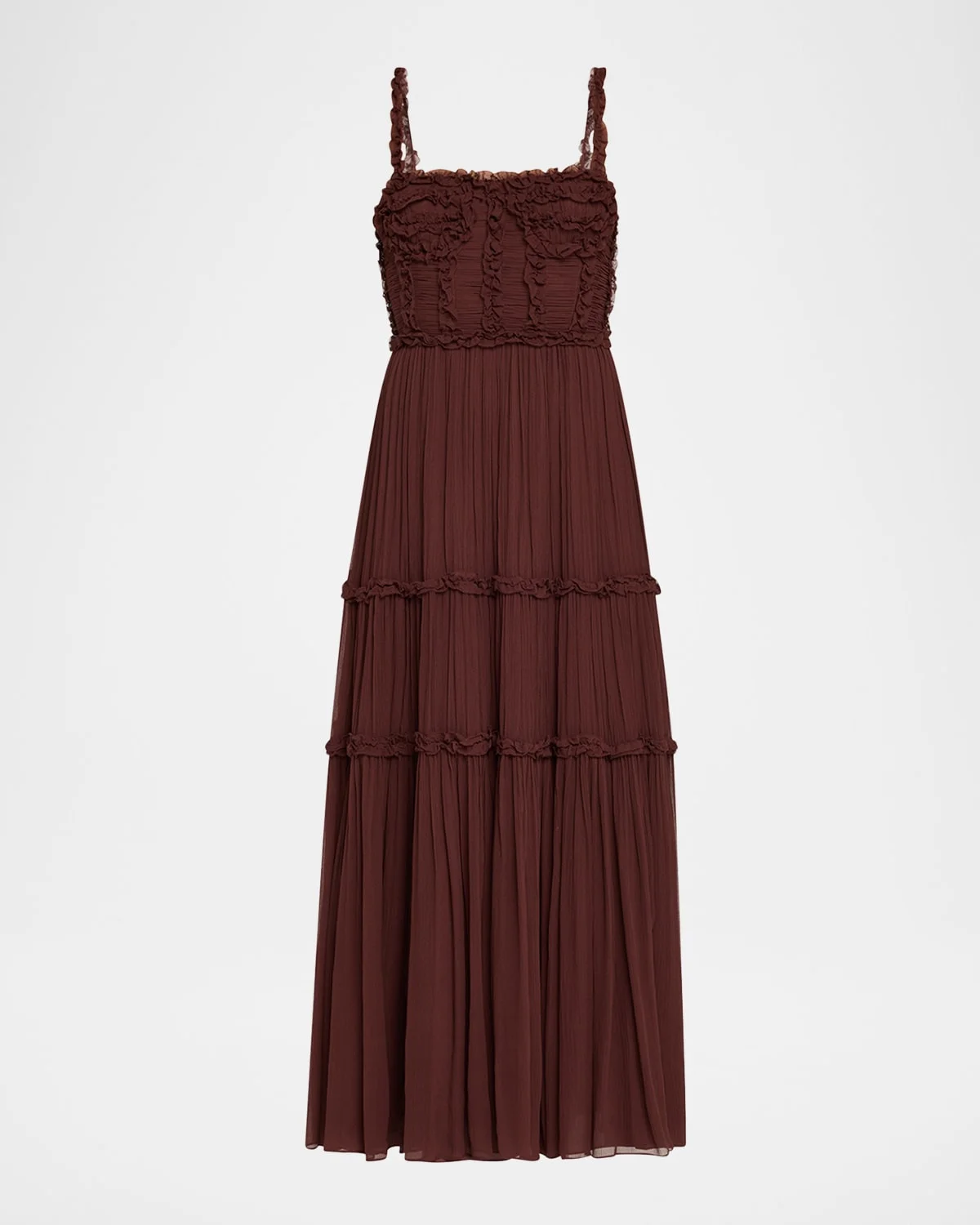 Ulla Johnson "Talitha" smocked luxurious silk midi dress elevated with a ruffled bodice Square neckline Sleeveless Tiered Aline silhouette Hem falls below the knee Side zip Silk Dry clean Imported