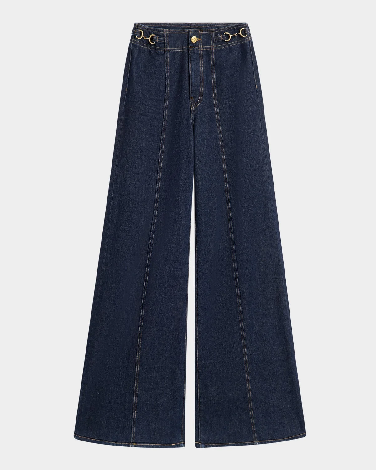 - Ulla Johnson "The Delphine" dark-wash jeans decorated with a chain detail on the waistband - High rise - Seamed front - Back patch pockets - Wide legs with a subtle flare - Full length - Button/zip fly - Cotton - Dry clean - Made in USA
