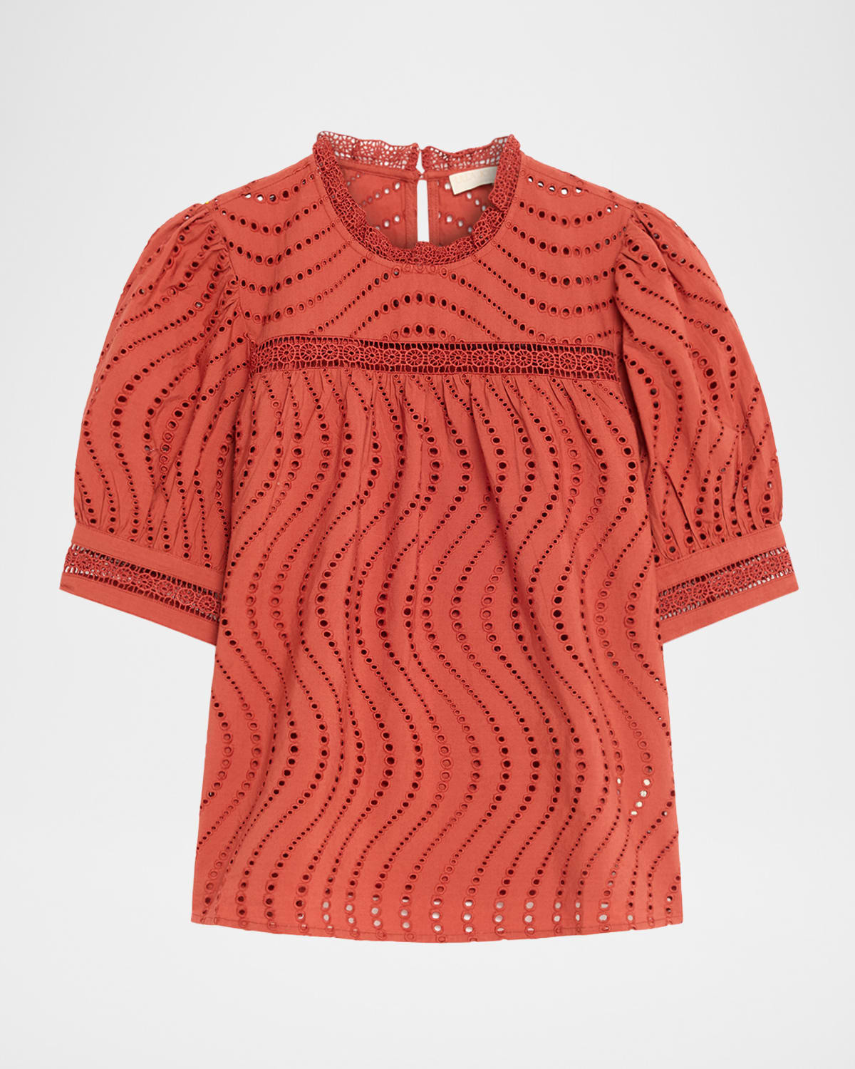 Ulla Johnson "Virginia" cotton eyelet top finished with lace trim Crew neckline Short puff sleeves Classic fit Hem falls to the hip Back keyhole closure Cotton Imported