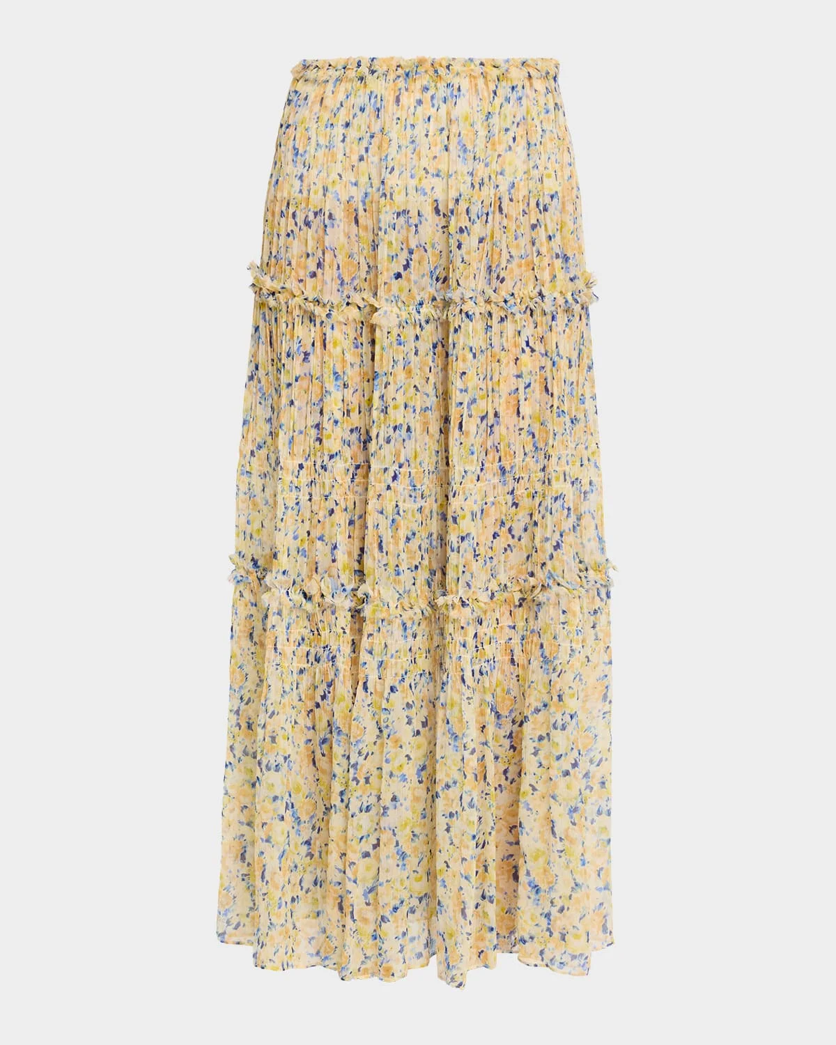 Designed with a delicate floral print, the "Virginie" midi & nbsp;skirt by Ulla Johnson is crafted from crinkled silk chiffon and boasts a tiered silhouette that effortlessly moves with every step. High rise Elastic waistband & nbsp; A-line silhouette Hem falls below the knee Pull-on style & nbsp; Silk Dry clean only & nbsp; Made in Poland