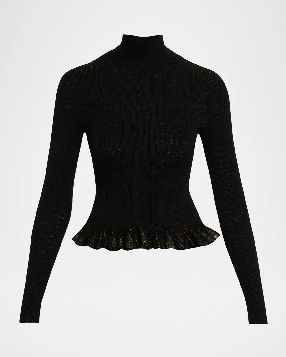 Ulla Johnson "Yulia" sparkly ribknit top finished with a delicate ruffle hem Turtleneck Long sleeves Slim fit Hem sits at the hip Pullover style Viscose/polyester Imported