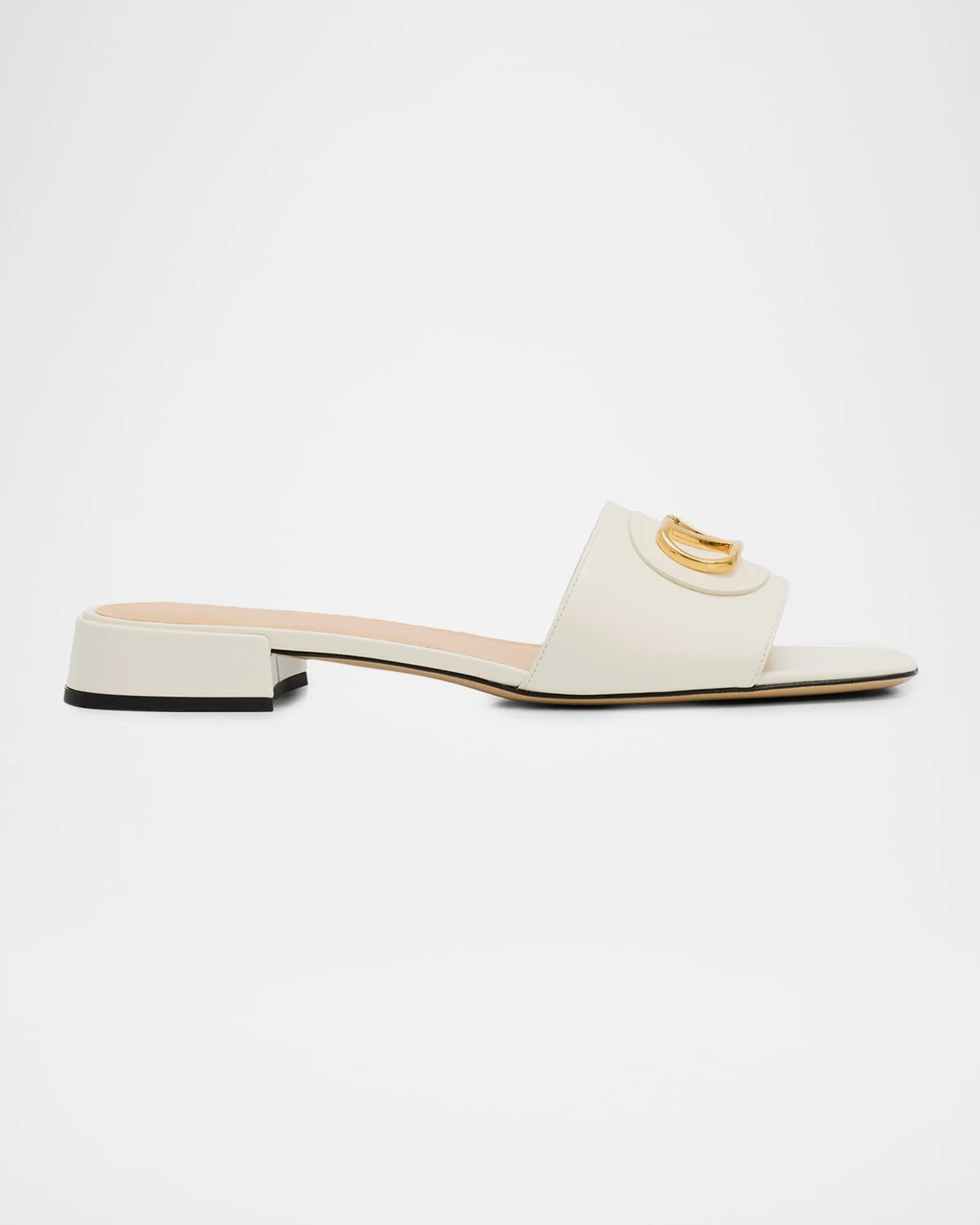 Valentino Garavani mule sandals are crafted from supple leather accented with a golden V logo medallion 0.75 in / 20 mm covered flat heel Square open toe Wide band upper Slide style Leather outsole Lining: Goat leather Made in Italy