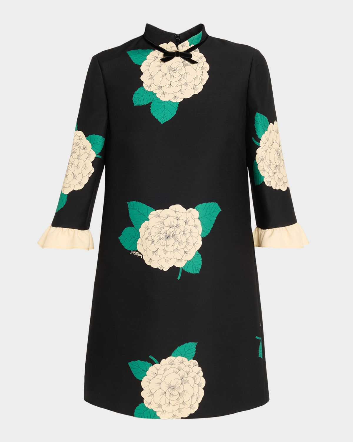 Valentino Garavani crepe couture dress crafted from Apres L'Hiver in macro ortensia motif Thin contrast bow around the neck Mock neckline Threequarter sleeves Hem falls above the knee Shift silhouette Back zip Virgin wool/silk Lining: Silk Made in Italy