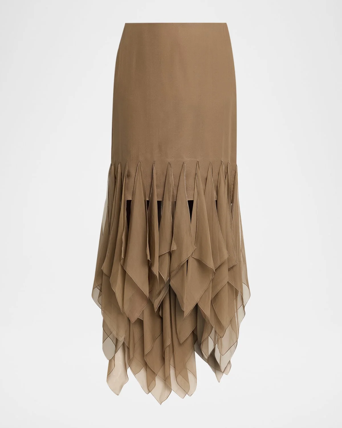 Crafted from subtly sheer silk chiffon, this Valentino Garavani skirt creates an airy feel with & nbsp;an asymmetric hemline and handkerchief panels. High rise Side zipper closure High-low hemline Pencil silhouette Silk Professional cleaning recommended Made in Italy SIZE & FITModel measurements: 5 & apos;10" tallModel is wearing a US size 4/Small