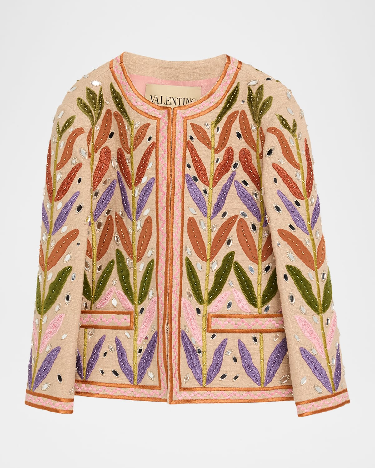 Valentino Garavani jacket in flax linen features leaf embroidery Embellished with mirrored crystals and beading Crew neckline; hook front 3/4 sleeves Faux welt pockets Boxy fit Flax Lining: Acetate/silk Made in Italy