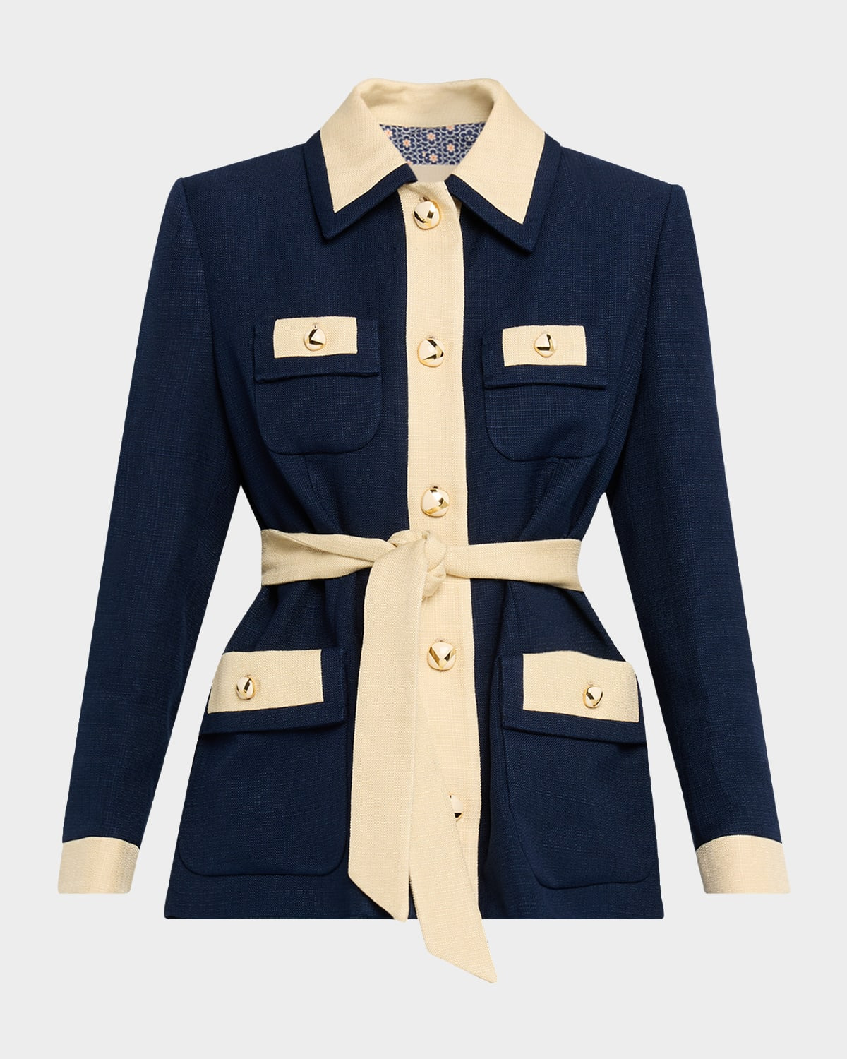 Valentino Garavani bicolor jacket featuring signature Vlogo buttons and a self belt Point collar; button front Long sleeves; button cuffs Front buttonflap pockets Selftie belted waist Straight fit Hip length Back walking vent Viscose Lining: Cotton Made in Italy