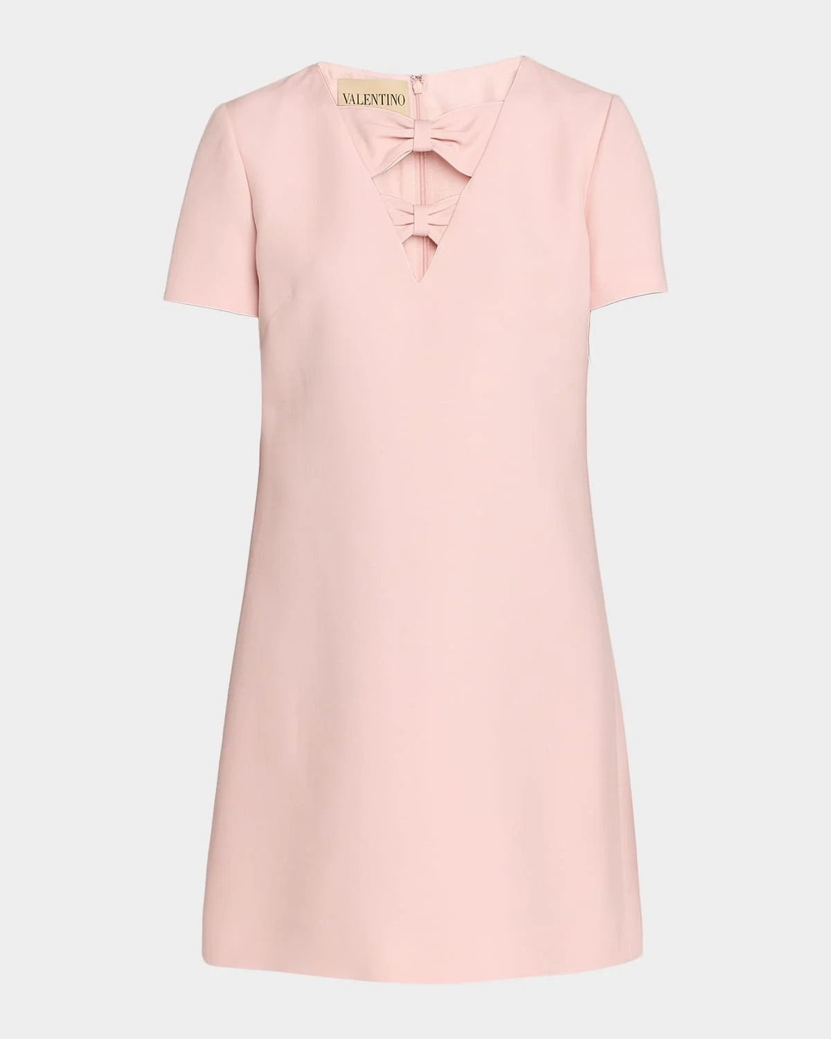 Valentino Garavani dress is crafted of crepe featuring a bow inset chest cutout Round neckline; plunging illusion Short sleeves Shift silhouette Mini length Invisible back zip Virgin wool/silk Made in Italy