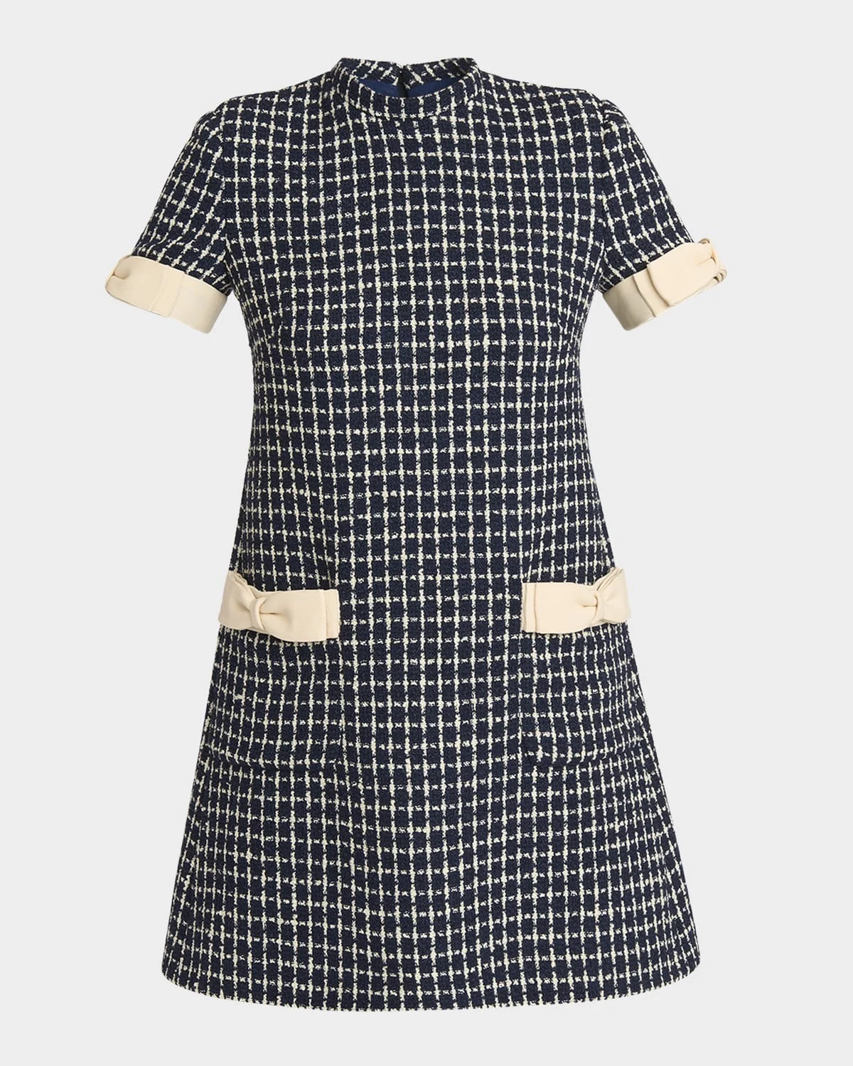 - Valentino Garavani mini dress in grid-patterned boucle with solid trim and bow embellishments - Mock neckline - Short sleeves - Front patch pockets - Hem falls above the knee - A-line silhouette - Back zipper - Virgin wool/cotton/nylon/polyamide - Lining: Acetate/silk - Made in Italy