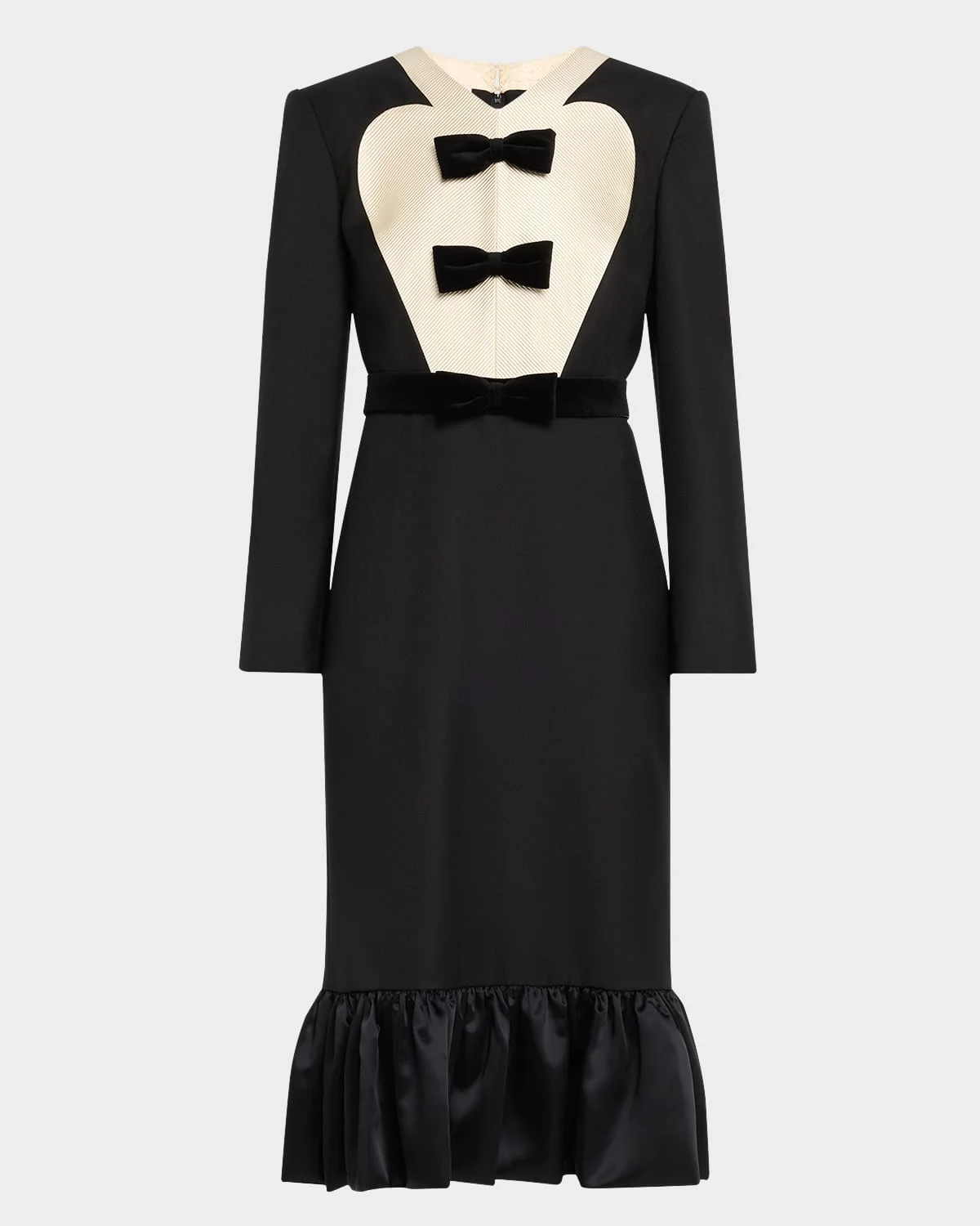 - Valentino Garavani dress featuring a ribbed tuxedo bib front with velvet bows and a satin ruffle hem - Round neckline - Long sleeves; button cuffs - Sheath silhouette - Hem falls below the knee - Invisible back zip - Virgin wool - Lining: Acetate/silk - Made in Italy