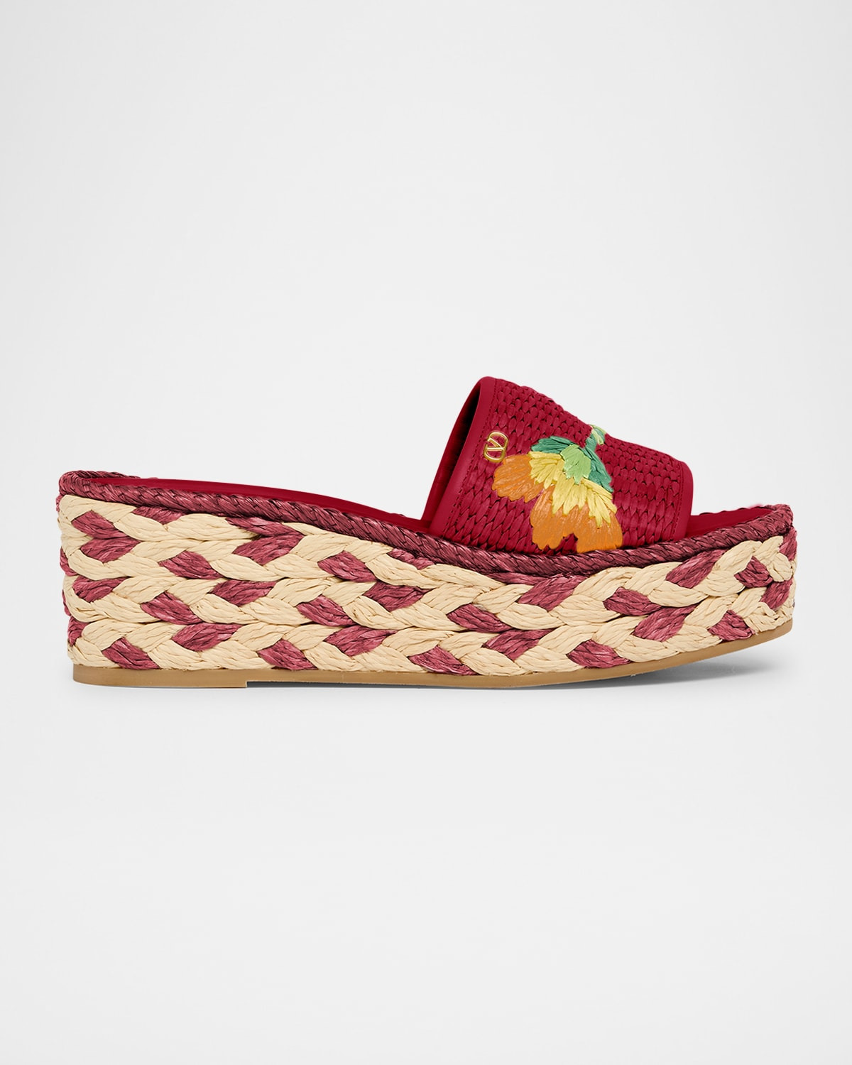 - Valentino sandals in calf leather and raffia - 2.50 in / 65 mm braided raffia platform heel - Open toe - Wide band upper with floral detailing - Slip-on style - Made in Italy - Size Note: Valentino Garavani shoes run small. Please order a 1/2 size larger than you typically wear.