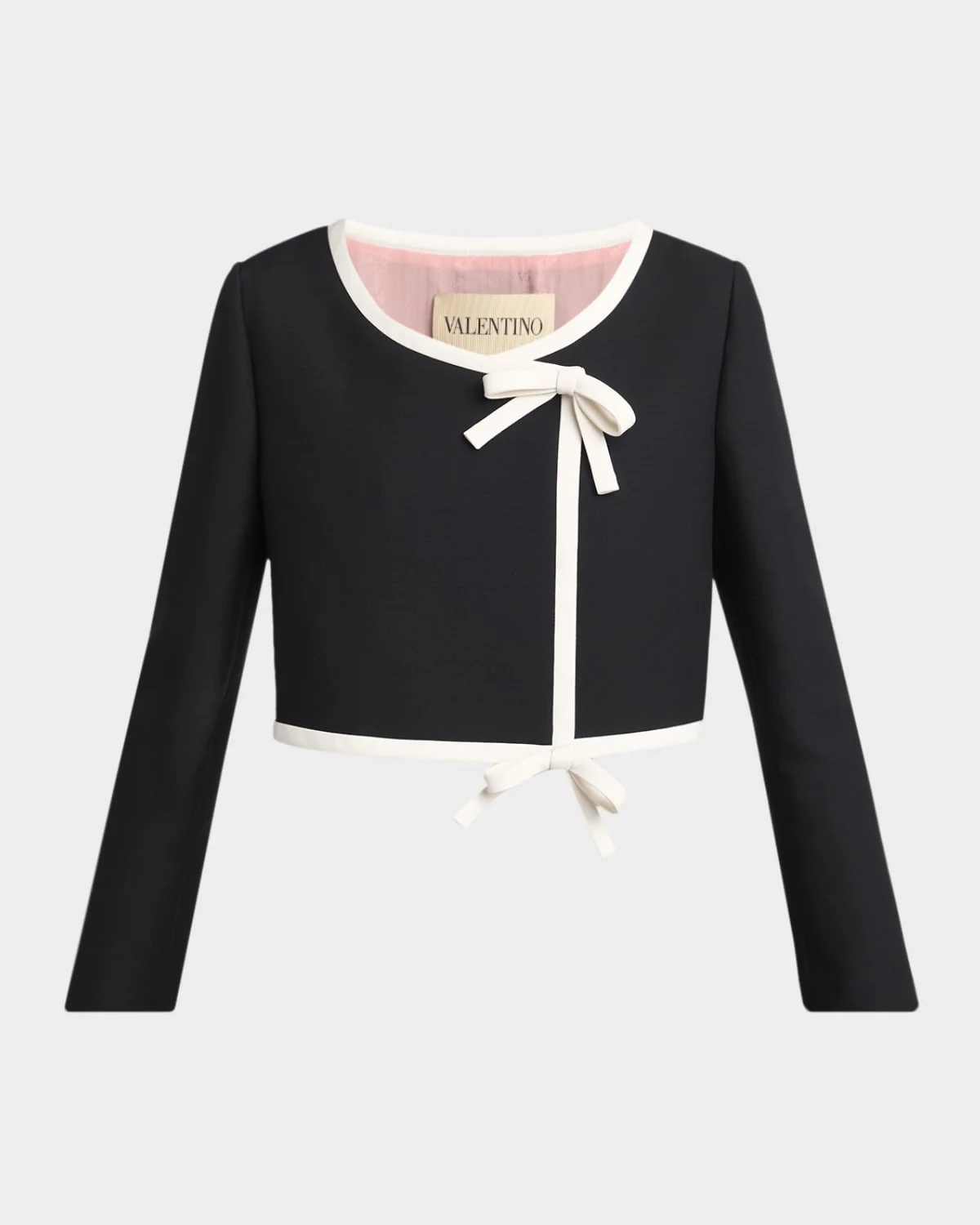 Valentino Garavani & nbsp;coat & nbsp;is crafted of wool-silk crepe featuring a contrast trim with a bow details Scoop neckline Off-center front closure Long sleeves Straight fit Cropped length Virgin wool/silk Made in Italy