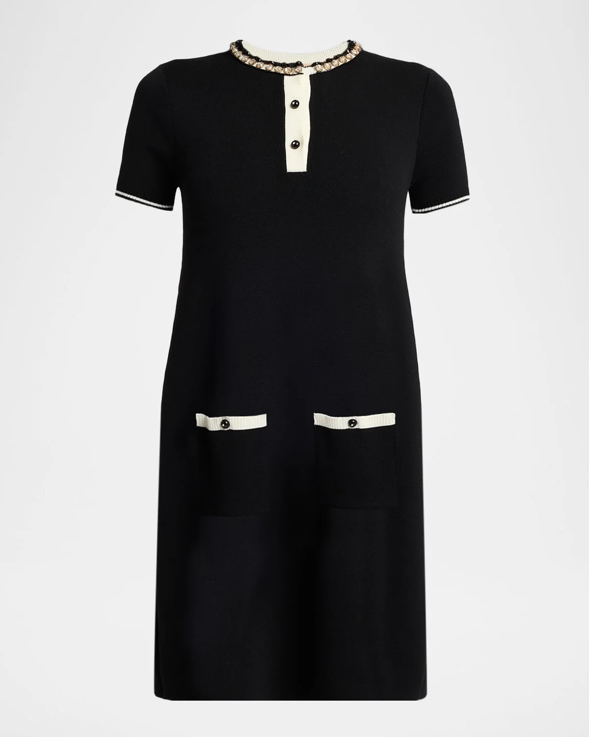 Valentino Garavani Henley sweater dress is embellished with crystal embroidery & nbsp;along the neckline and & nbsp;a contrast button placket and pocket trim Round neckline; three-button front Short sleeves; ribbed cuffs Hip button-patch & nbsp;pockets Shift silhouette Mid-thigh length Slipover style Viscose/polyester Made in Italy