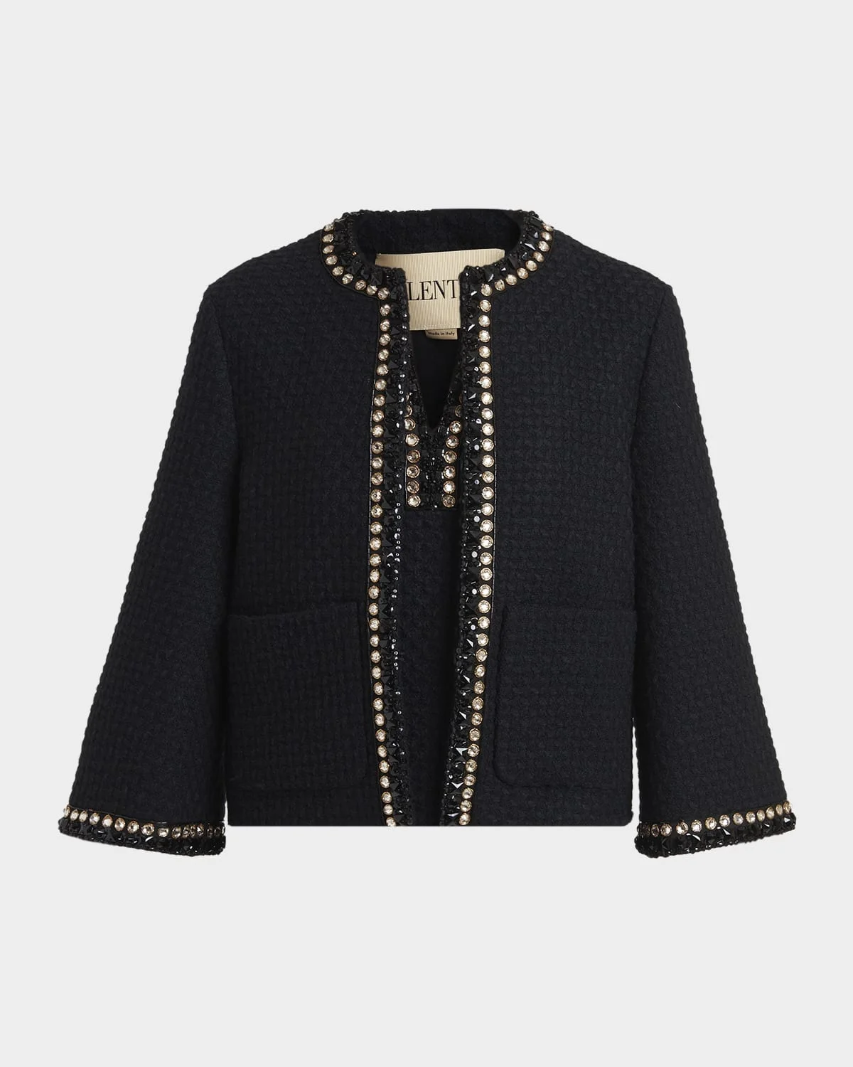 Valentino Garavani coat is crafted of wool jacquard, embellished with crystal embroidery along the edges Round neckline; open front Long sleeves Padded shoulders Straight fit Hip length Acrylic/virgin wool Made in Italy