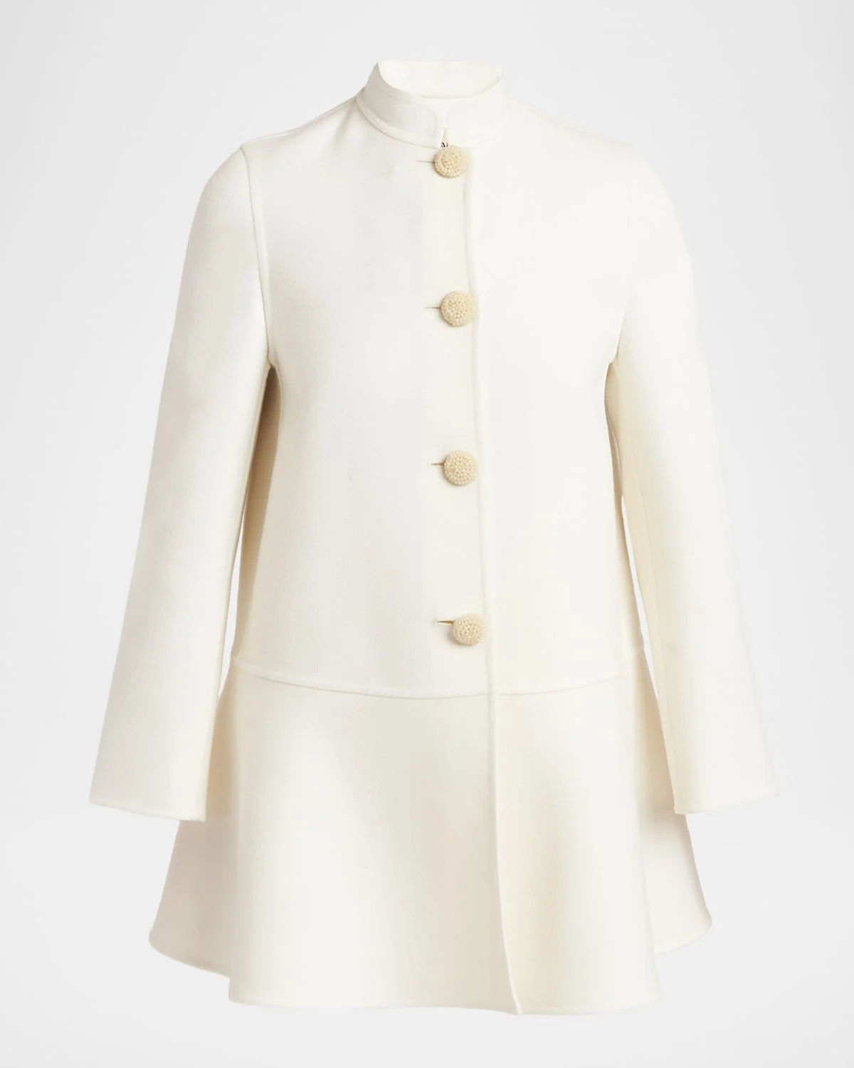 Valentino Garavani coat is tailored in a brushed woolcashmere blend adorned with bead embellished buttons and a flared hem panel Stand collar; singlebreasted front Long sleeves Straight fit Hem falls below the hip Virgin wool/cashmere Made in Italy