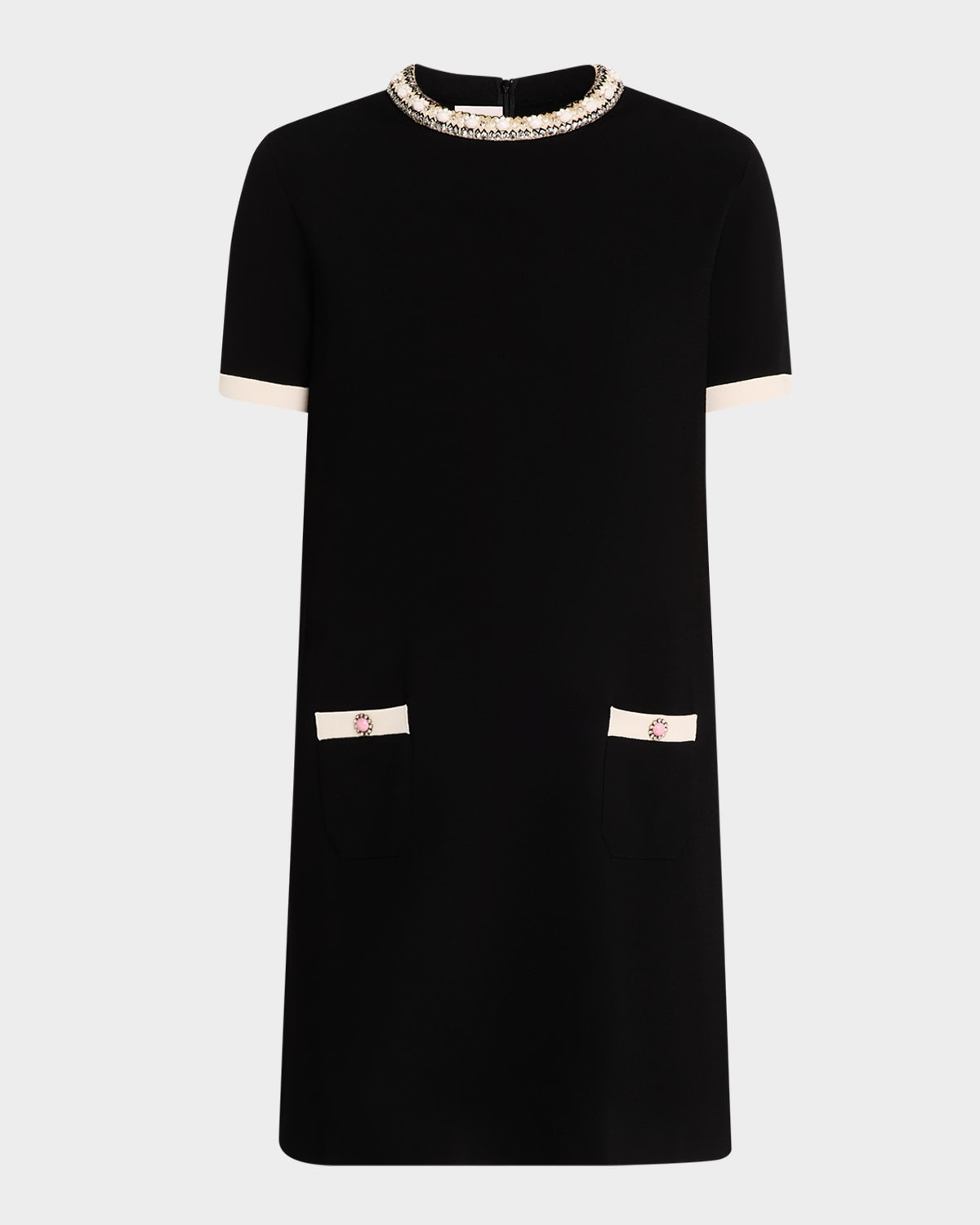 Valentino Garavani stretch viscose knit dress featuring bead embroidered neckline, contrast ribbed cuffs, and front patch pockets with novelty buttons Round neckline Short sleeves Shift silhouette Mini length Invisible back zip Viscose/polyester Made in Italy