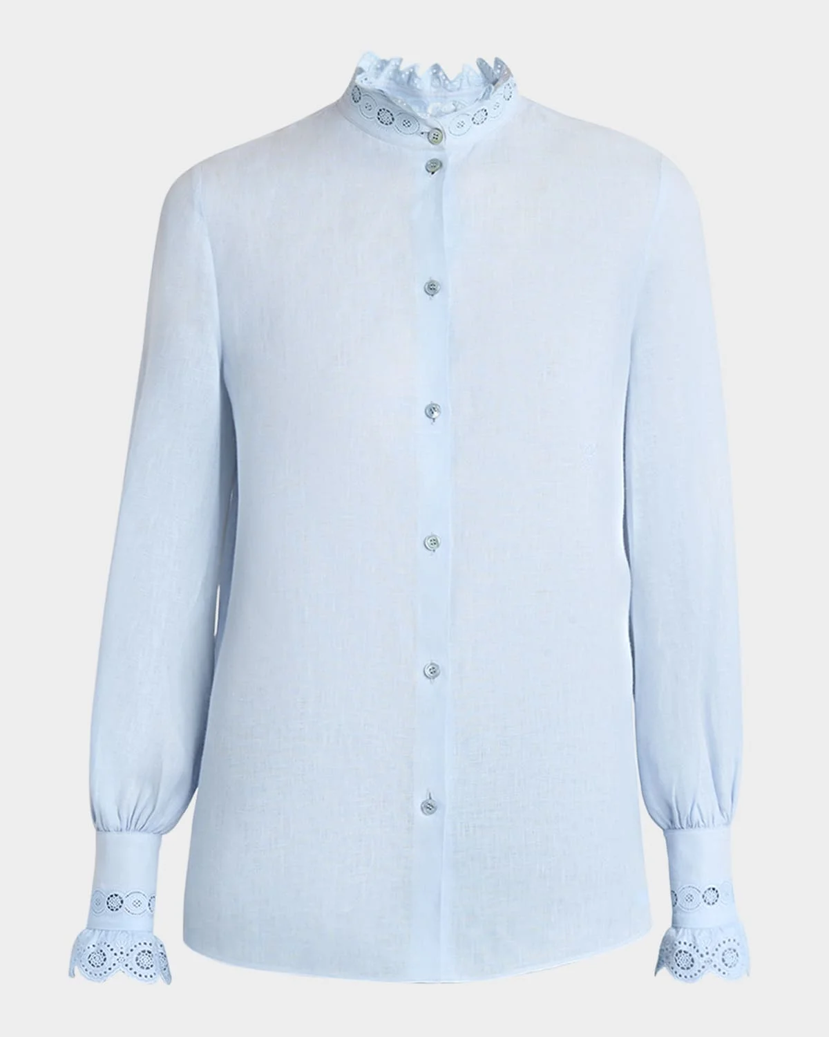 - Valentino Garavani flax shirt featuring eyelet embroidered ruffle collar and cuffs - Ruffle mock neckline; button front - Long sleeves; button cuffs - Yoked back; box pleat - Relaxed fit - Shirttail hem - Flax/mother-of-pearl - Made in Italy