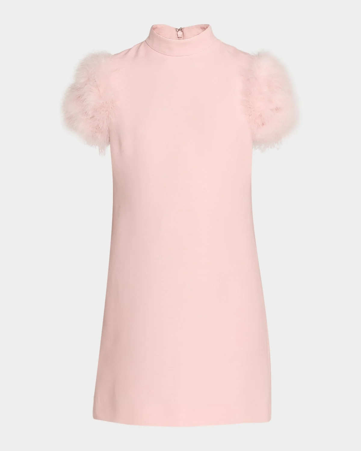 Valentino Garavani dress is crafted of a woolsilk crepe adorned with ostrich feather trim on the sleeves Mock neckline Short sleeves Shift silhouette Mini length Invisible back zip Virgin wool/silk/feather Made in Italy