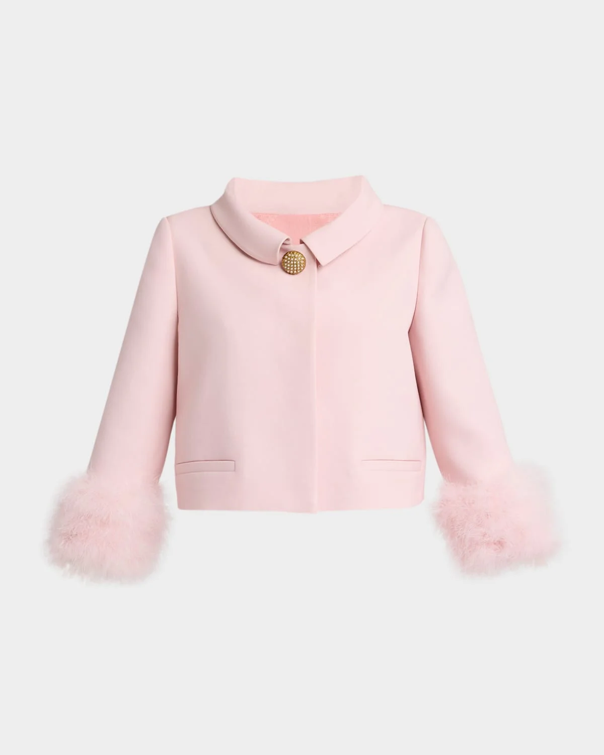 Valentino Garavani jacket is crafted from a woolsilk crepe couture adorned with feather trim along the cuffs and a pearly goldtone novelty button Point collar; singlebreasted front 3/4 sleeves Hip welt pockets Straight fit Hip length Virgin wool/silk Made in Italy