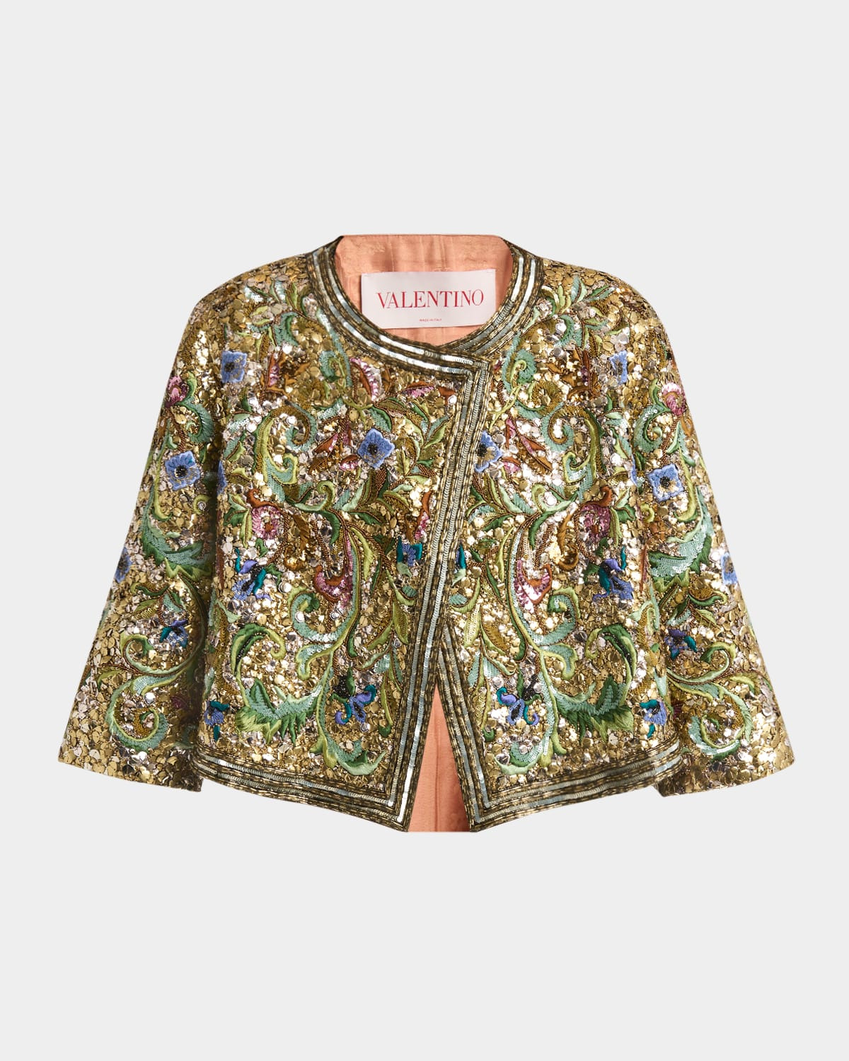 - Valentino Garavani floral embroidered caplet jacket with sequin embellishment - Round neckline - Three-quarter sleeves - Boxy fit - Silk - Acetate/silk lining - Made in Italy