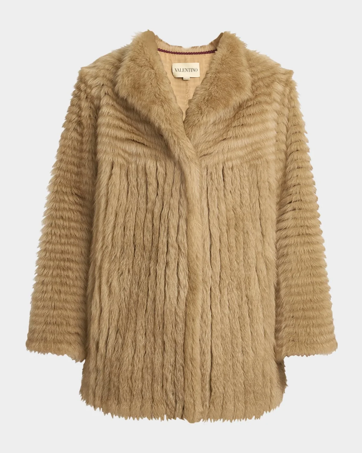 - Valentino Garavani coat in fluted dyed sheep shearling (Italy) - Spread collar; single-breasted front - Long sleeves - Straight fit - Hem falls below the hip - Shearling - Made in Italy