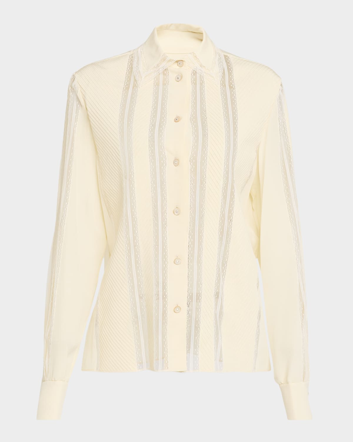 - Valentino Garavani pleated crepe de chine shirt featuring lace stripe insets - Point collar; button front - Long sleeves; button cuffs - Yoked back; box pleat - Relaxed fit - Silk/mother-of-pearl - Made in Italy