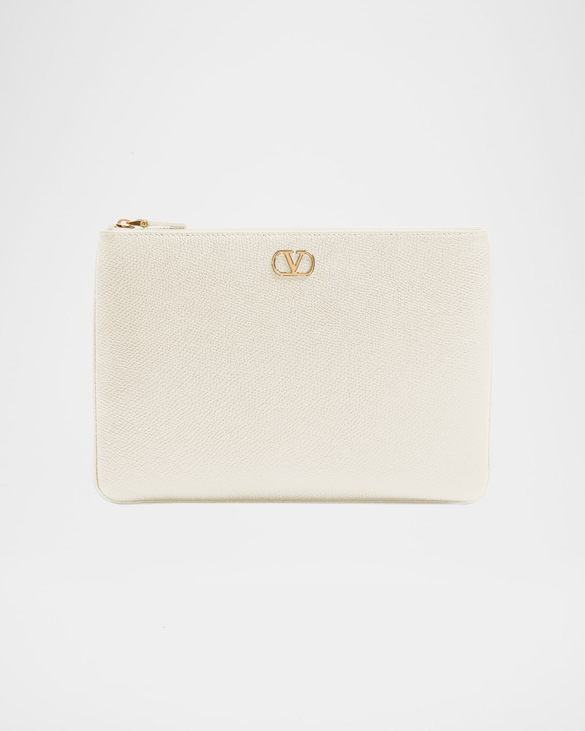 - Valentino Garavani pouch bag in leather - Features signature VLOGO accent - Zip top closure - Interior, three card slots - Golden hardware - Approx. 6.5"H x 9.4"W x 0.2"D - Made in Italy
