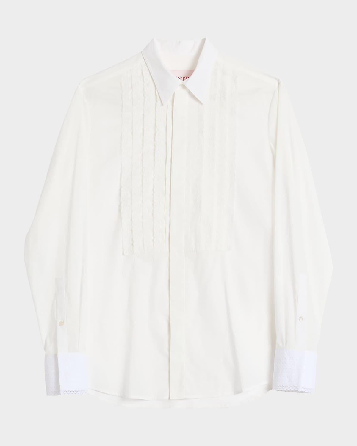 - Valentino Garavani tuxedo shirt with lace plastron and cuffs - Point collar - Concealed button placket - Long sleeves - Yoked back shoulders - Cotton/nylon/polyamide - Made in Italy - Model is 6'1"/185cm.