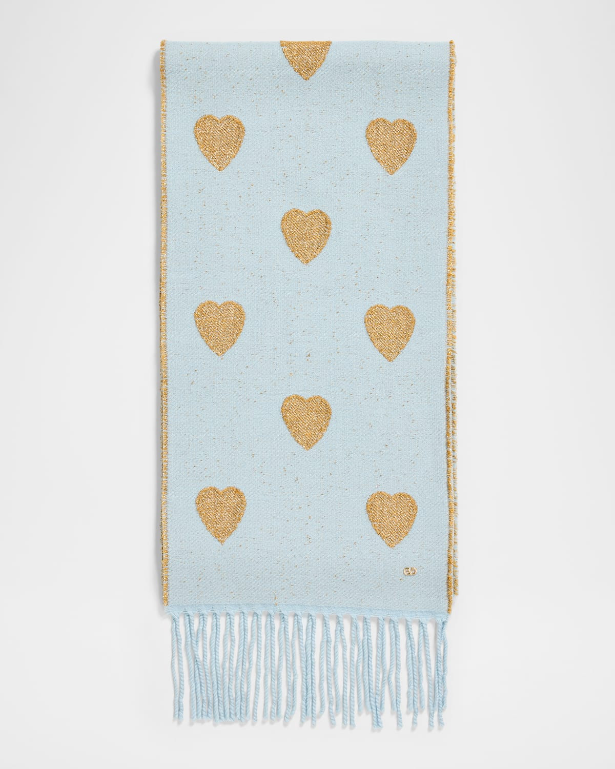 - Valentino Garavani scarf with metallic heart intarsia - Fringe edges - May be styled multiple ways - Virgin wool/viscose/Lurex® metallic fibers - Made in Italy