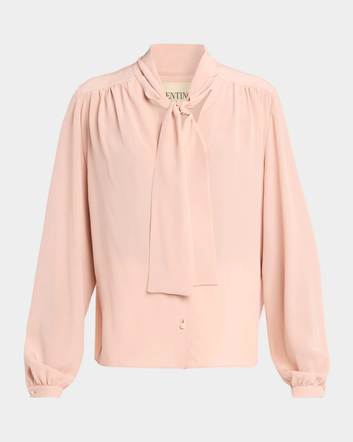 Crafted from fluid silk crepe, this shirt from Valentino Garavani features a neck scarf, gathered shoulders, and pearlescent buttons Band collar; button front Long sleeve; button cuffs Relaxed fit Straight hem Silk Made in Italy