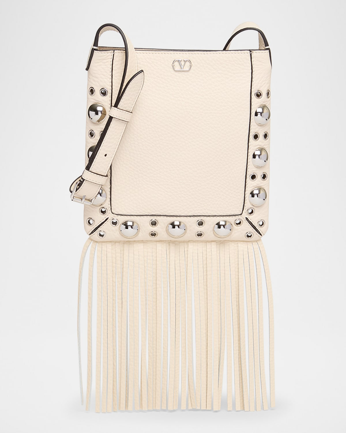- Valentino Garavani "Nellcote" leather crossbody bag with studs and fringe trim - Features signature VLOGO hardware - Adjustable crossbody strap - Open top - Approx. 7.9"H x 7.9"W x 1.2"D - Made in Italy