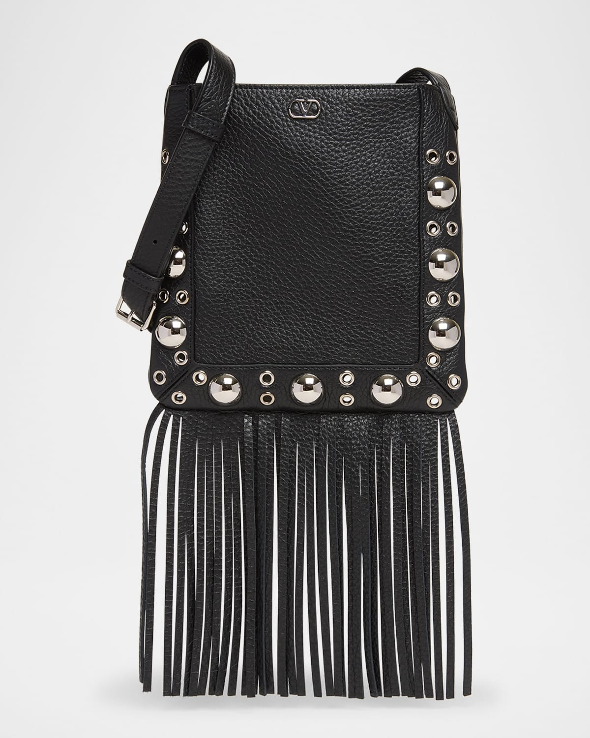 - Valentino Garavani "Nellcote" leather crossbody bag with studs and fringe trim - Features signature VLOGO hardware - Adjustable crossbody strap - Open top - Approx. 7.9"H x 7.9"W x 1.2"D - Made in Italy