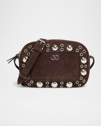 - Valentino Garavani "Nellcote" camera crossbody bag in suede adorned with grommets and metallic domed studs - Features signature VLOGO accent - Adjustable crossbody strap - Zip top closure - Interior, two card slots - Approx. 6.3"H x 9.1"W x 2.4"D - Made in Italy