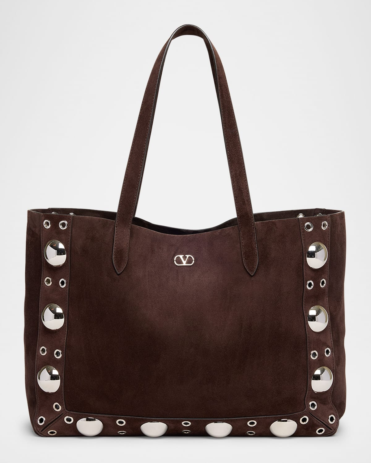- Valentino Garavani "Nellcote" suede tote bag with studded trim - Features signature VLOGO accent - Shoulder straps - Open top - Interior, leashed zip pouch bag - Approx. 11.8"H x 15.7"W x 5.1"D - Made in Italy